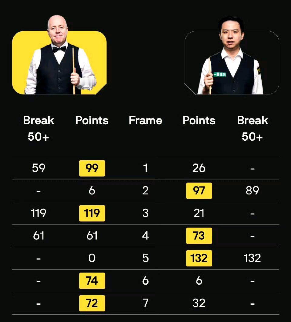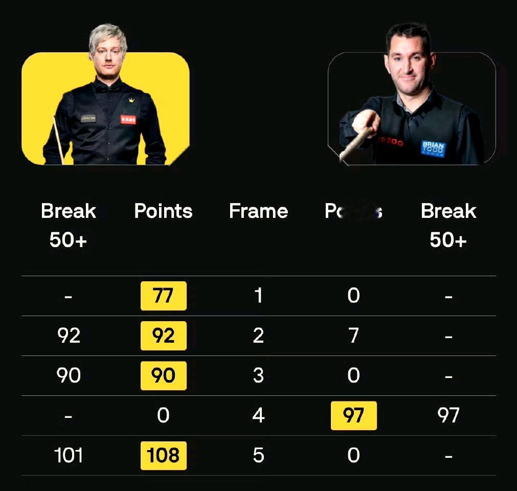 冠中冠最后一组比赛,肖国栋遭希金斯绝杀,赵心童是四强里的中国独苗。 肖国栋3-4希金斯 罗伯逊4-1汤姆福德