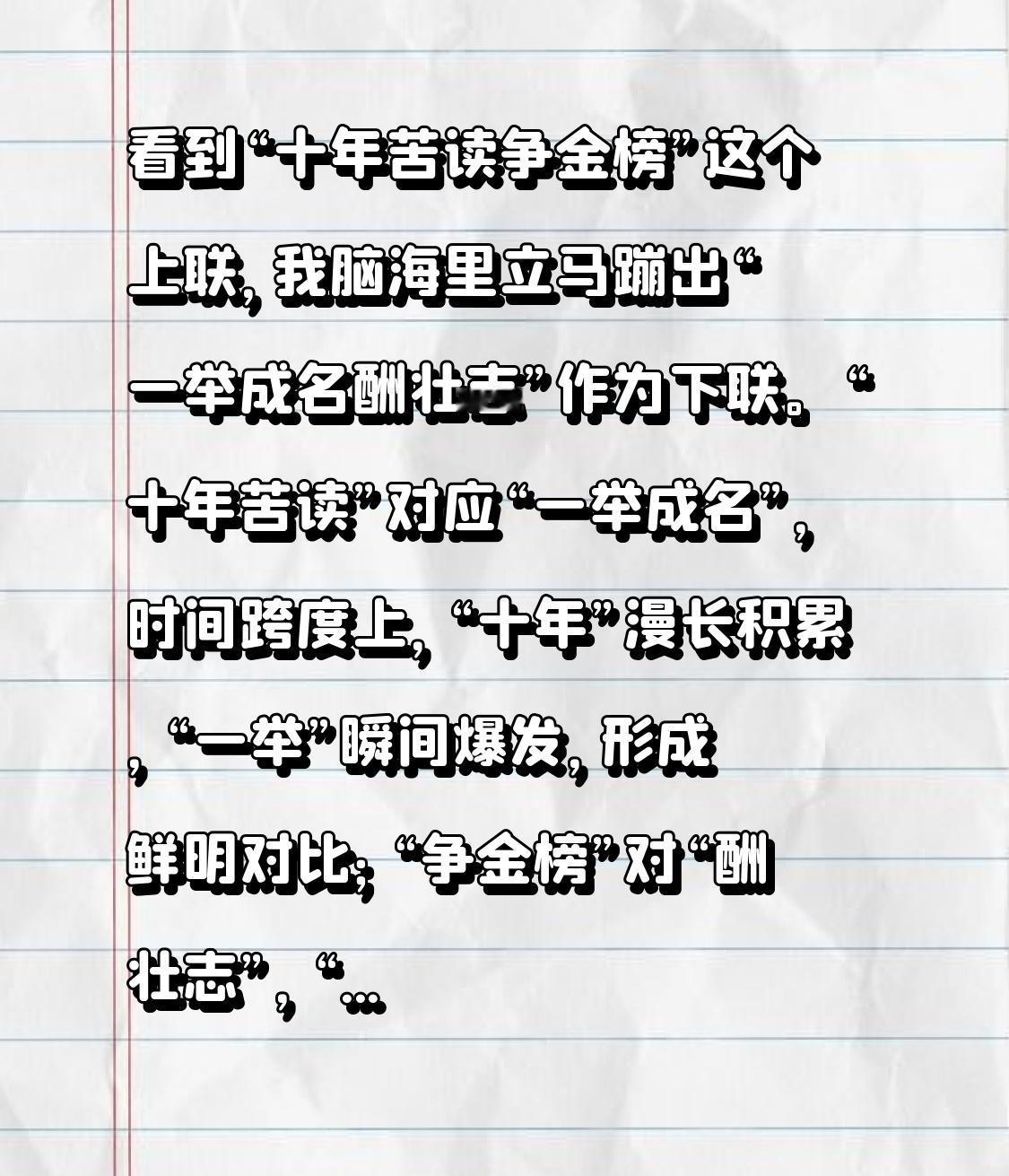 看到“十年苦读争金榜”这个上联,我脑海里立马蹦出“一举成名酬壮志”作为下联。 “十年苦读”对应“一举成名”,时间跨度上,“十年”漫长积累,“一举”瞬间爆发,形成鲜明对比;“争金榜”对“酬壮志”,“争”体现了苦读学子的拼搏,“酬”则展现了成功后的壮志得偿。这副对联完美诠释了莘莘学子寒窗苦读,只为一朝功成名就的心境。就像很多人经历多年学习,就盼着在重要考试中脱颖而出实现梦想。
