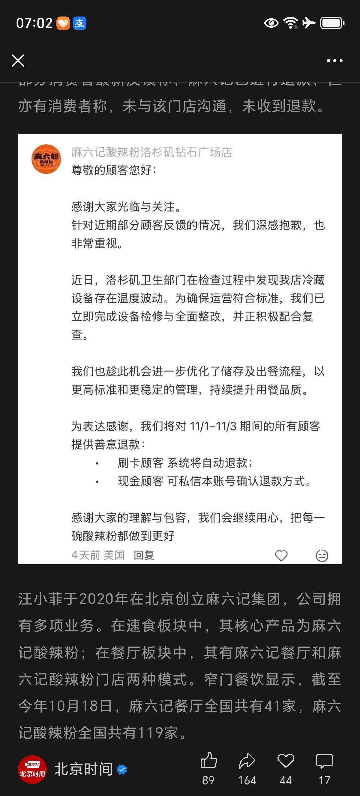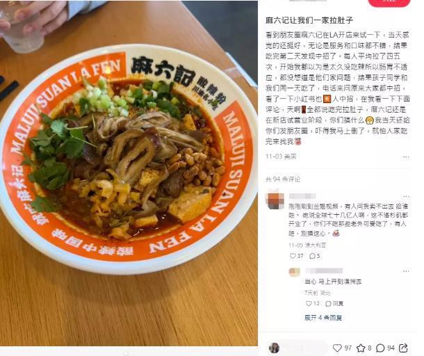 要说最近餐饮圈的大新闻,汪小菲旗下麻六记的美国首店绝对算一个——刚开业没两周,就被洛杉矶卫生局勒令关门了,这波“出海首秀”属实有点翻车。 10月28日,麻六记酸辣粉洛杉矶钻石广场店热热闹闹开业,本以为能借着国潮风在海外圈一波粉,结果没几天就画风突变。不少消费者在社交平台吐槽,吃完之后直接上吐下泻,“肚子绞痛到一直跑厕所”“腹泻到没力气出门”,还有人说全家都中招了,只能赶紧向当地卫生局投诉。 这投诉一扎堆,卫生局立马就上门检查了。11月13日官方消息一出,大家才知道问题出在哪:门店一个冷藏间根本达不到约5℃的安全温度,食材存着都有风险,属于“迫切健康风险”,直接贴了停业通知 。简单说就是,食材没存好,吃了容易闹肚子,这在餐饮行业可是最基础的红线啊! 面对质疑,门店账号倒是很快回应了,说对顾客的不适深感抱歉,已经连夜检修冷藏设备、全面整改,还承诺给11月1日到3日的顾客退款 。不过网友们并不买账,有人吐槽“善意退款”这说法太敷衍,还有人说自己没收到退款,得主动找门店沟通才行。更有意思的是,麻六记官方热线接线员说“对加盟店有卫生标准”,但具体是什么标准又说不清楚,这回应也是有点含糊 。 其实这已经不是麻六记第一次陷入食安争议了,今年7月就有消费者投诉在Costco买的麻六记酸辣粉发霉,最后代工商和品牌方都道歉了,还召回了问题产品 。这次海外开店本来是扩张的好机会,结果栽在了最基础的冷藏设备上,确实有点不应该。 现在门店还关着,得等整改完、通过卫生局复查才能重新开业。网友们的看法也挺两极,有人觉得“明星品牌扩张太快容易忽视细节”,也有人说“偶尔翻车可以理解,关键看整改态度”。不过话说回来,餐饮行业拼到最后,拼的不就是食品安全和用心吗?尤其是出海做品牌,一举一动都代表着国内餐饮的口碑,可不能马虎。 至于汪小菲本人,这次倒是没出面回应,只有工作人员说会“配合调查、整改到位”。后续这店能不能顺利复业,退款和补偿能不能落实到位,还得再等等看。希望这次能真的吸取教训,别让“国潮出海”变成“食安翻车”的代名词啊!