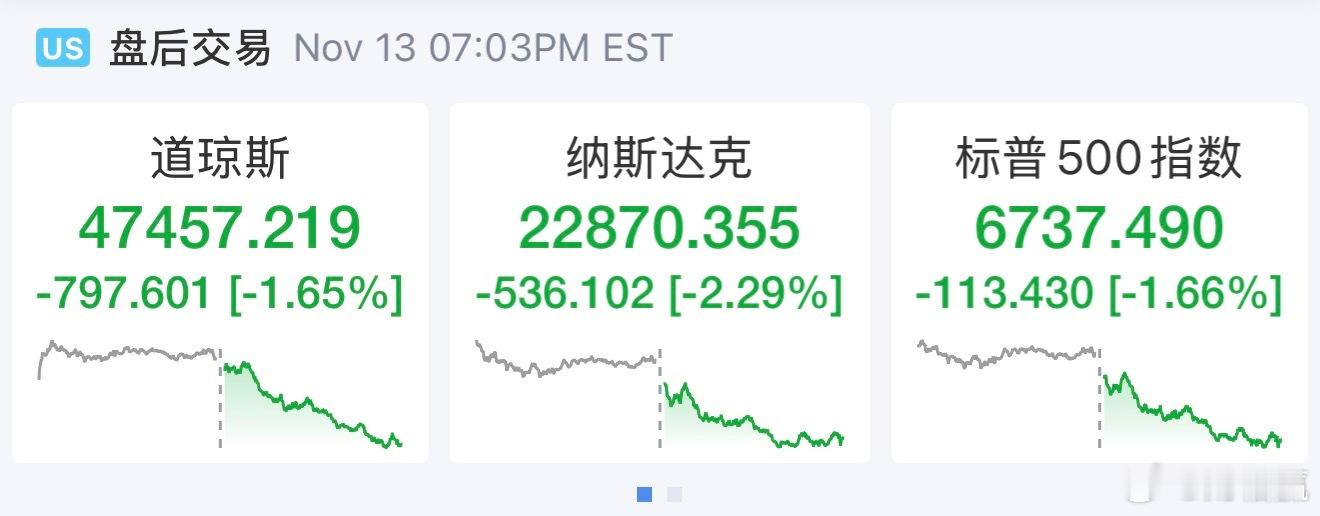 北京时间11月14日凌晨,美股周四大幅收跌,纳指连续第三个交易日下滑。市场正进行大规模板块轮动,科技股仍令主要股指承压。尽管美国政府已在创纪录时长停摆后重新开门,投资者对利率前景的悲观情绪仍在加剧。道指跌797.60点,跌幅为1.65%,报47457.22点;纳指跌536.10点,跌幅为2.29%,报22870.36点;标普500指数跌113.43点,跌幅为1.66%,报6737.49点。纳斯达克综合指数在周四交易时段一度跌破50日移动均线22810.13点,最低下降至22796.07点。