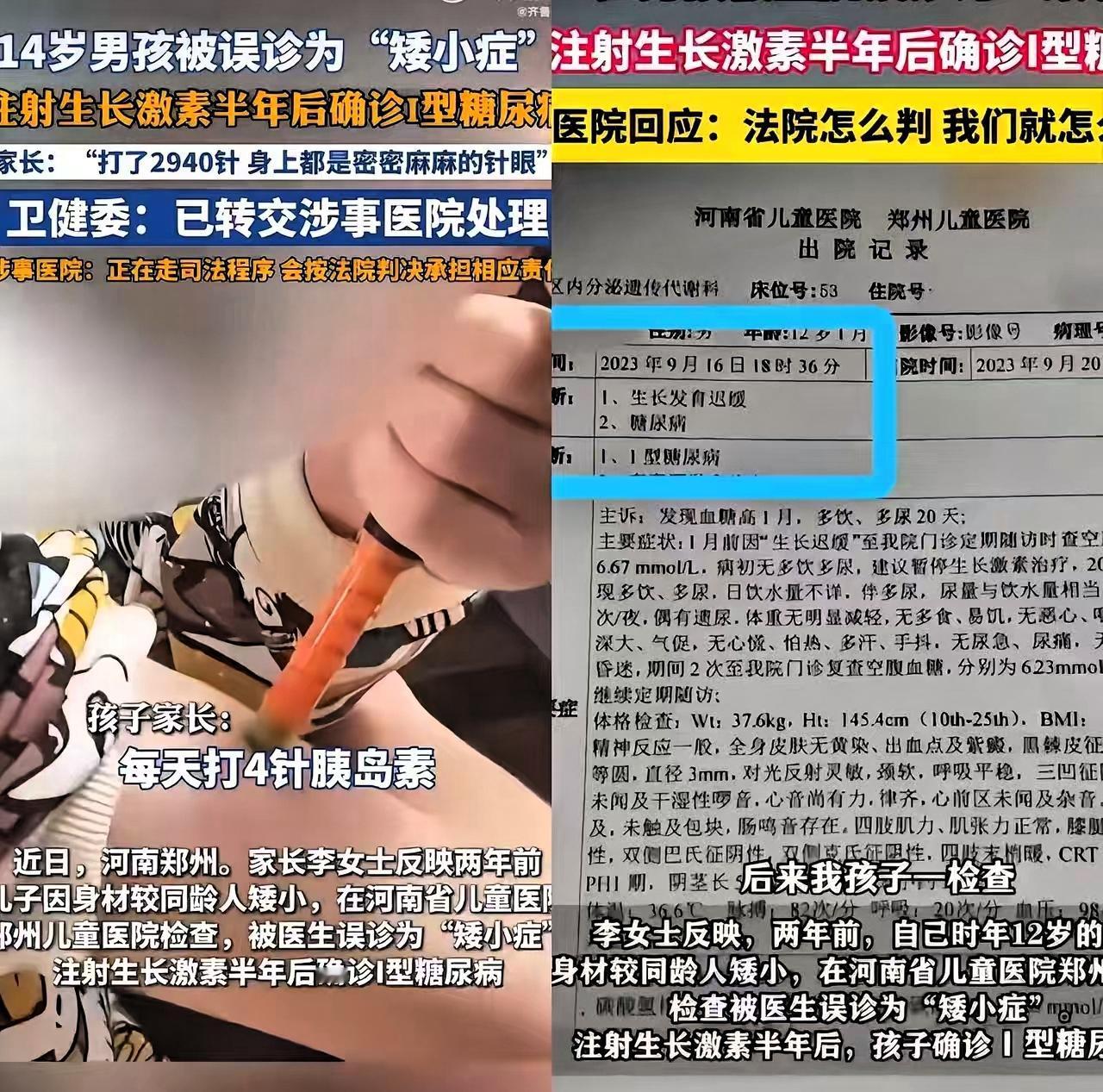 全网最惨的应该是河南这个小男孩了 打了大半年的生长激素 1身高没见长,反而患上糖尿病需要终身注射胰岛素,这事看完实在让人心里不是滋味。 孩子身高低于同龄人,父母着急是人之常情,带他去河南省儿童医院检查后,被诊断为矮小症。为了让孩子能跟上同龄人,家长遵医嘱坚持给孩子打针,半年下来,孩子身上满是针眼,可身高没任何起色,反倒查出了糖尿病——原来最初的诊断是误诊。 原本该在校园里自在成长的少年,如今要一辈子和胰岛素相伴,正常的生活节奏被彻底打乱,这样的结果任谁都难以接受。 网上对此议论纷纷,有人觉得家长被身高焦虑影响,过于盲从才导致这样的后果;也有人认为医院诊疗存在疏漏,作为专业医疗机构,没能准确诊断就让孩子长期用药,责任难辞其咎。 其实这场悲剧,不能简单归咎于某一方。家长希望孩子能有理想身高的心情可以理解,但身高并非人生的唯一衡量标准,面对这类需要长期用药的诊疗,多做几家医院复核、全面评估风险,会更稳妥; 而医院作为救死扶伤的机构,诊断环节的严谨性直接关系到患者的健康,尤其涉及未成年人用药,更该慎之又慎,不能有半点马虎。 孩子的健康从来容不得试错,身高焦虑不该成为盲目决策的理由,医疗诊疗的严谨底线也不能失守。无论是家长还是医疗机构,都该以孩子的长远健康为首要考量。