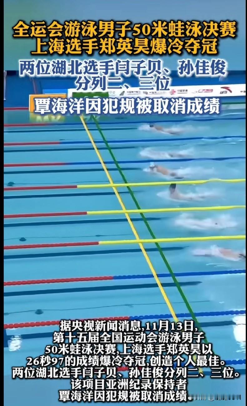 全运蛙泳爆大冷!上海黑马郑英昊26秒97夺冠,覃海洋犯规成绩没了 全运会50米蛙泳决赛直接杀疯了! 谁能想到啊,11月13日这场决赛,上海选手郑英昊直接爆冷拿了金牌,26秒97还是个人最佳!湖北的闫子贝、孙佳俊分了二三名,结果最炸的是——亚洲纪录保持者覃海洋居然因为犯规,成绩被取消了! 这剧情比电视剧还刺激啊!本来以为覃海洋稳拿牌的,结果突然“出局”,黑马直接冲顶,赛场这变数也太让人心脏骤停了! 郑英昊这波真的是“悄咪咪憋大招”,直接把奖牌揣兜里了。你们看比赛的时候是不是也以为覃海洋稳了?