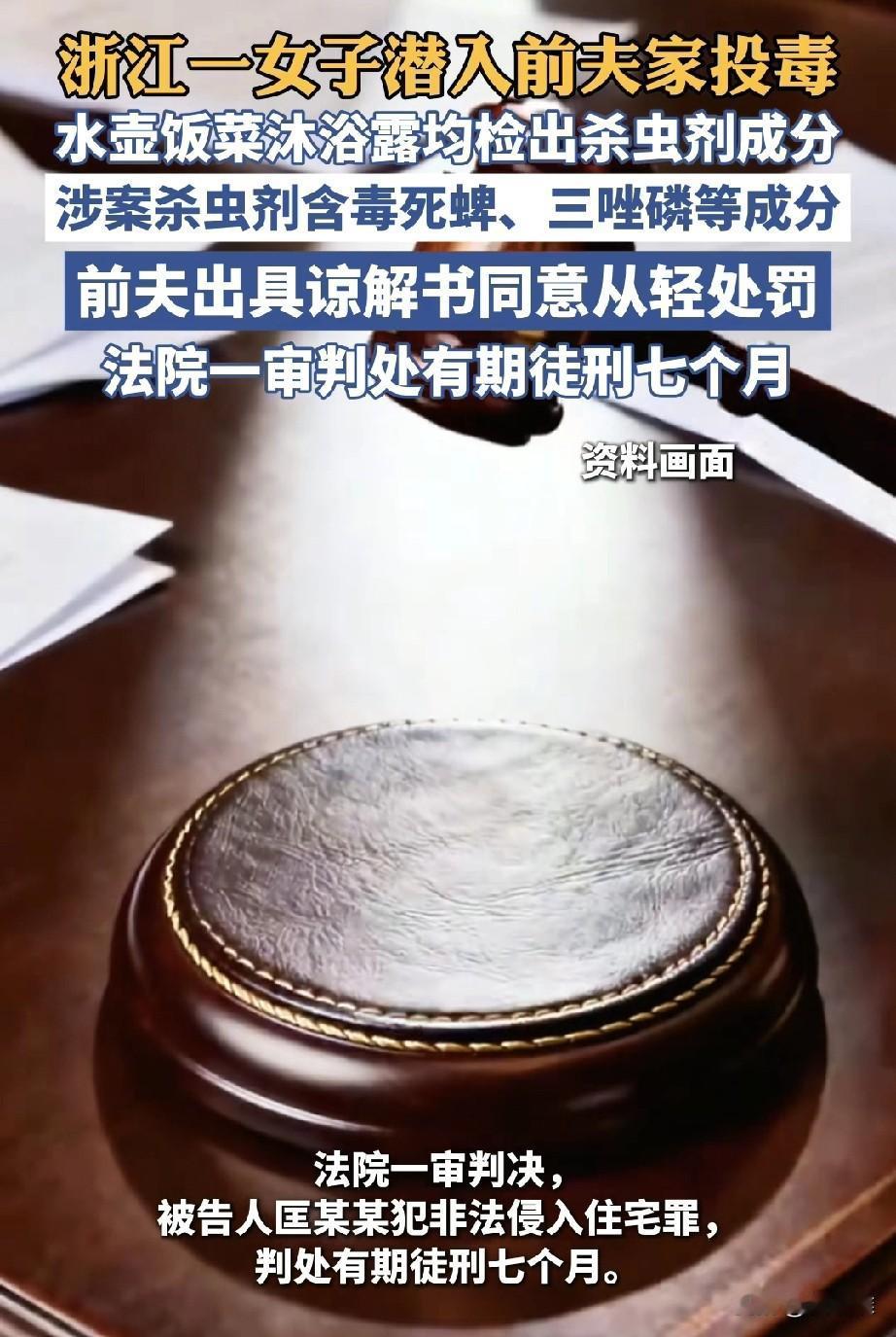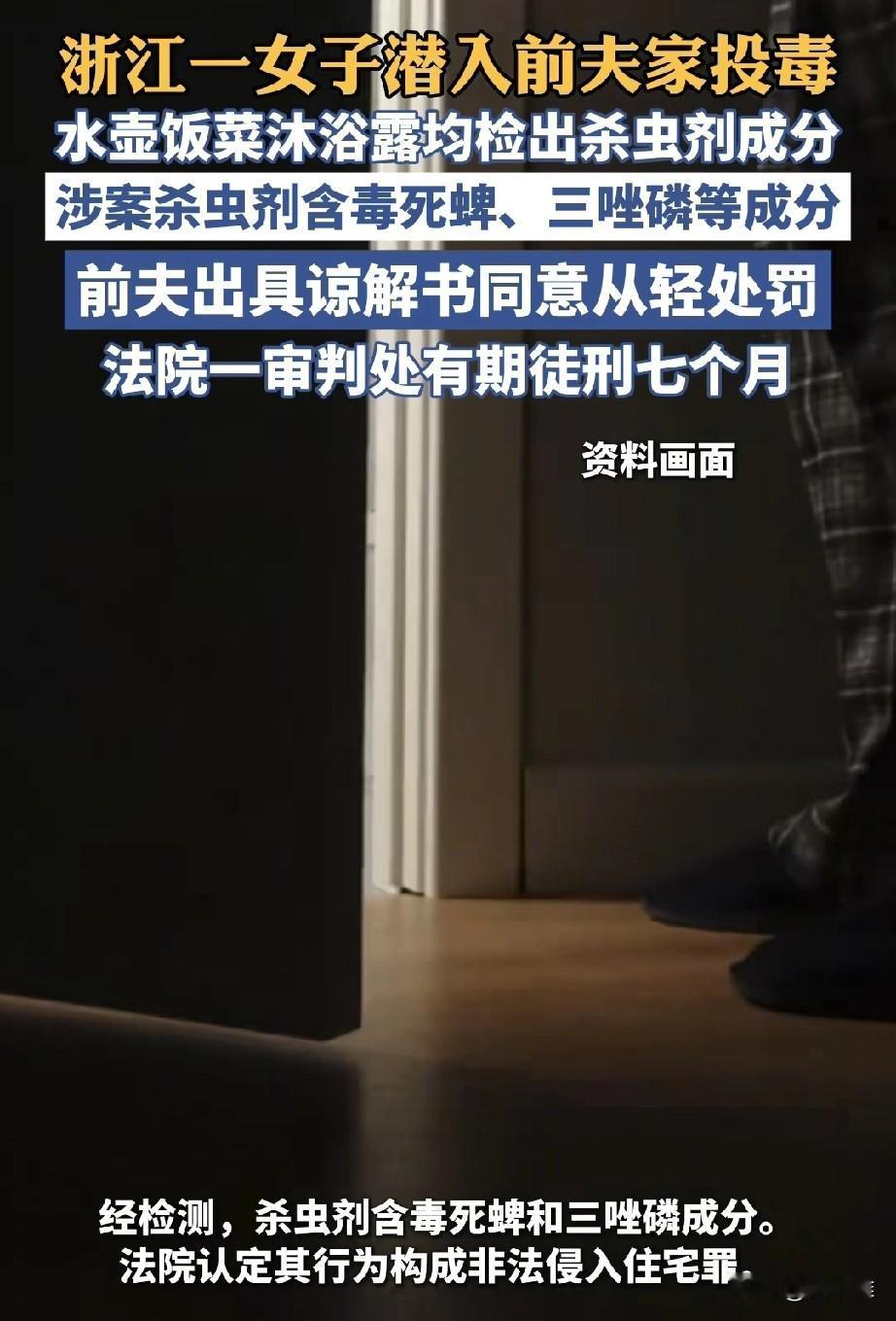 “好歹毒的女子!”女子与前夫离婚后一直心存怨气,看到前夫过的潇洒自由更是气不打一处来。她趁前夫外出之际,悄悄潜入他的家中,拿出事先稀释过的杀虫剂投放到了前夫所使用的水壶,饮料,甚至沐浴露中。前夫回到家中察觉到了不对劲,打开监控看到了女子恐怖的一幕。随后报警,女子被逮捕后承认了因心生怨气,对前夫所采取的报复性投毒行为,法院审理阶段女子前夫对她出具了谅解书,后来法官经过综合考量认为女子的投毒行为没有给前夫造成实质伤害,并且取得了受害人的谅解,投放的杀虫剂也是经过稀释的,最后判处女子七个月有期徒刑! 我觉得女子前夫还是一个比较不错的人,面对女子的谋害竟然选择了谅解,女子应该在狱中好好反省反省!