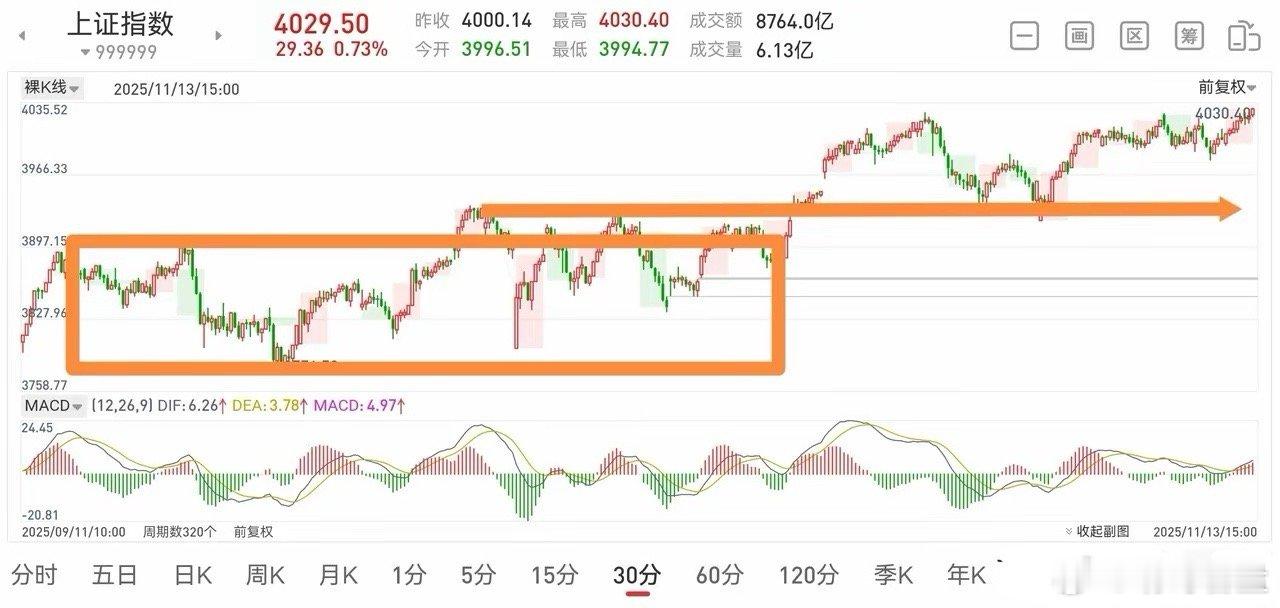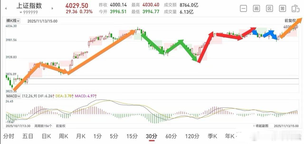 记录一二11月14日周五:收阴线,或星线备注:觉得有用就看,没用划走就行!联想:昨天收一个大点的阳线,放量!早上回踩一下3990附近支撑,之后震荡上行,创出了本轮新高。需要注意的是4025附近有压力,这里第二次冲击,连续三天才突破,但是也还在附近;放量,说明抛压在变大!那么,接下来就不可以缩量,否则承接力度不够肯定要回落。周五了,以市场的习惯,连续放量概率不大。谨慎观察,关注量能…关注:无(位置太高了,没见过🐄市面,胆子小)相信国运,静待花开…