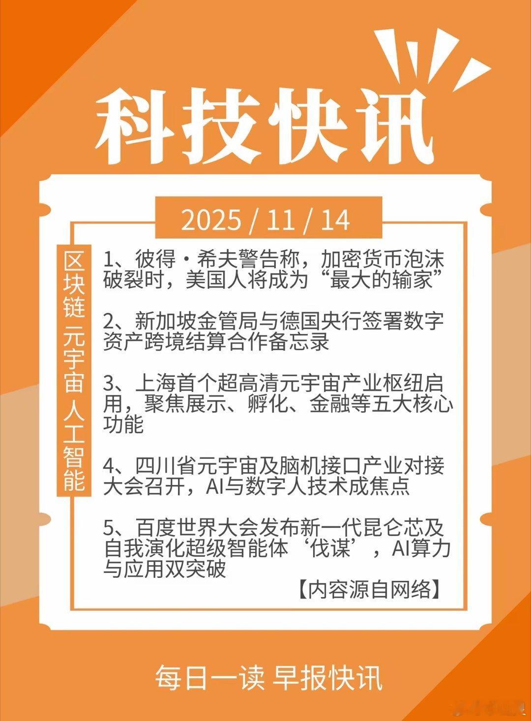 科技快讯 | 11月14日 星期五1、彼得·希夫警告称,加密货币泡沫破裂时,美国人将成为“最大的输家”:“成为比特币资本家要付出沉重代价”2、新加坡金管局与德国央行签署数字资产跨境结算合作备忘录3、上海首个超高清元宇宙产业枢纽启用,聚焦展示、孵化、金融等五大核心功能4、四川省元宇宙及脑机接口产业对接大会召开,AI云抱抱与数字人技术成焦点5、百度世界大会发布新一代昆仑芯及自我演化超级智能体‘伐谋’,AI算力与应用双突破—内容源自网络—、、