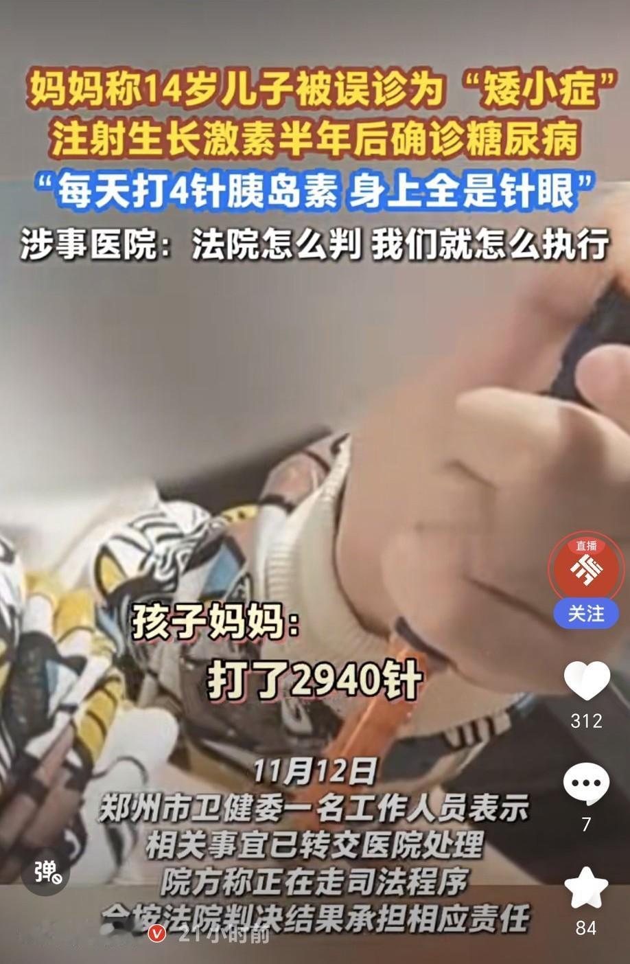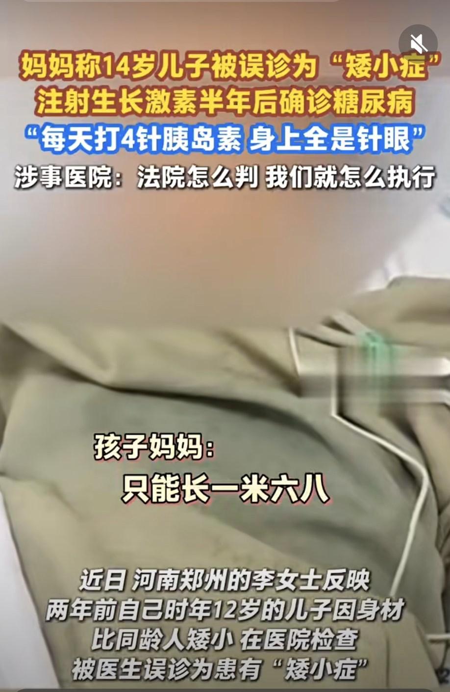 河南郑州14岁男孩被误诊矮小症,半年内打了2940针生长激素,最后确诊I型糖尿病。家长一开始因孩子身高增长慢带他去看病,治疗中多次质疑高频次注射,却没得到医院重视。 生长激素使用有严格规定,这医院未排除风险、准确诊断就贸然治疗,违背了诊疗常规。虽说司法鉴定医院过错与损害是次要因果关系,但诊疗中的疏漏失职太明显。 A网友:168还叫矮小症?你家两口子都是两米大个?家长脑子少一窍,被骗了钱,还毁了孩子一生的健康。 B网友:半年2940针,震惊。这医生真不是人,赚钱没底线,胡乱骗人打针治疗,硬生生把好好的孩子变成了终生依赖胰岛素的糖尿病人,造孽啊! C网友:真是服了,1米68也不矮呀?我包括我身边的很多人都1米68左右挺正常的呀!中国男人的平均身高也就1米68左右,可能有的都没有1米68,就是正常身高,虽然偏矮一些,但怎么就矮小症了?还非得打针?真服了现在的家长,只要是激素都会有影响。 D网友:无语,1米68还是矮小症啊?我家广东那边基本都矮,男人1米60左右大把的,我哥也就1米58。 没病别去医院找病生,哪个医生也不是神医,不敢说的那么绝对,说你没病,万一你病了,你去找人家,不你说的我没病么?(医生高水平的全国能找出多少)?通常世俗的逻辑就是:你来医院,就按有病治(没病你来啥医院),疗程就是这么个疗程。这一针针下去,扎碎了孩子和家庭的希望,I型糖尿病让孩子要终身依赖胰岛素,这么沉重的代价谁来承担?