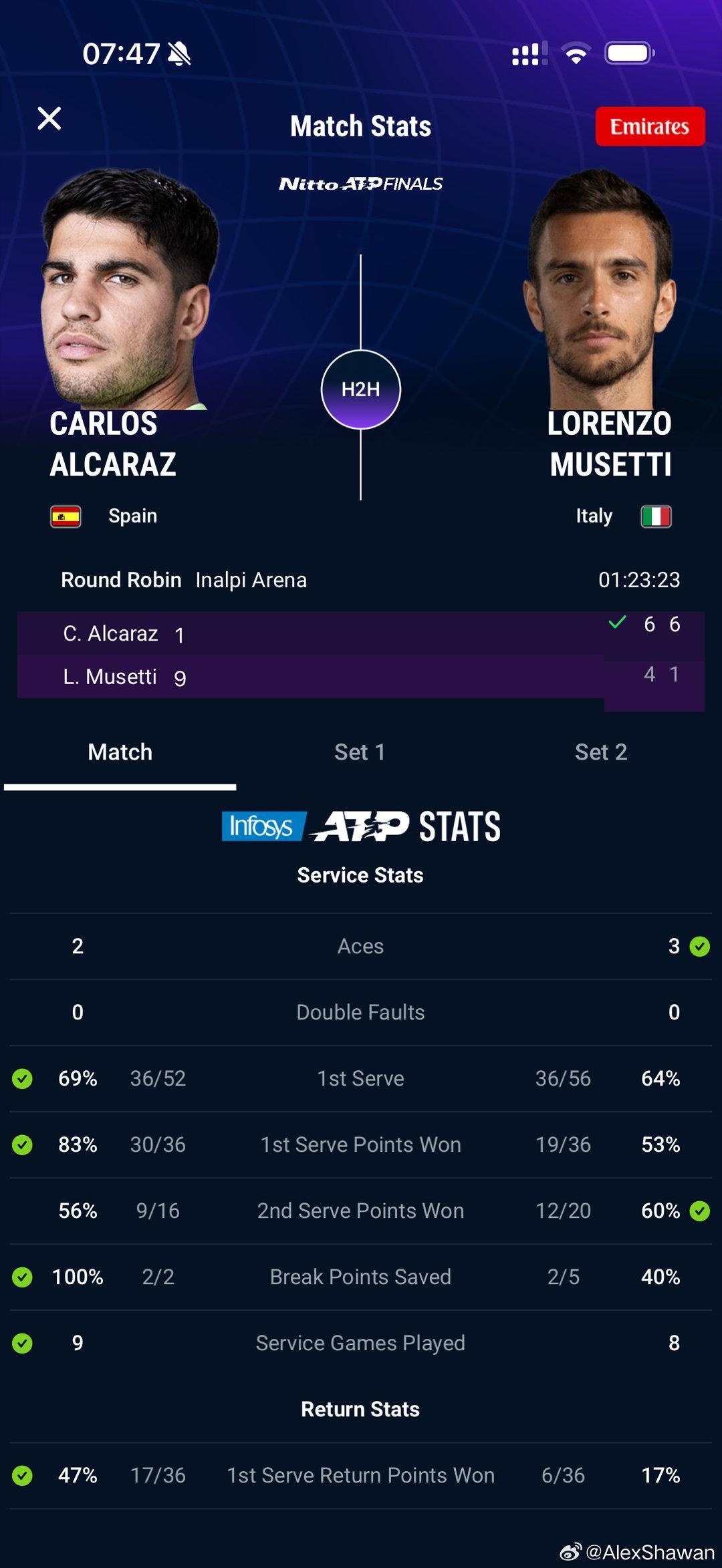 阿卡头名晋级,避免提前遇辛纳总决赛康纳斯组最后一轮阿尔卡拉斯6比4、6比1横扫穆塞蒂三战全胜小组头名晋级4强!