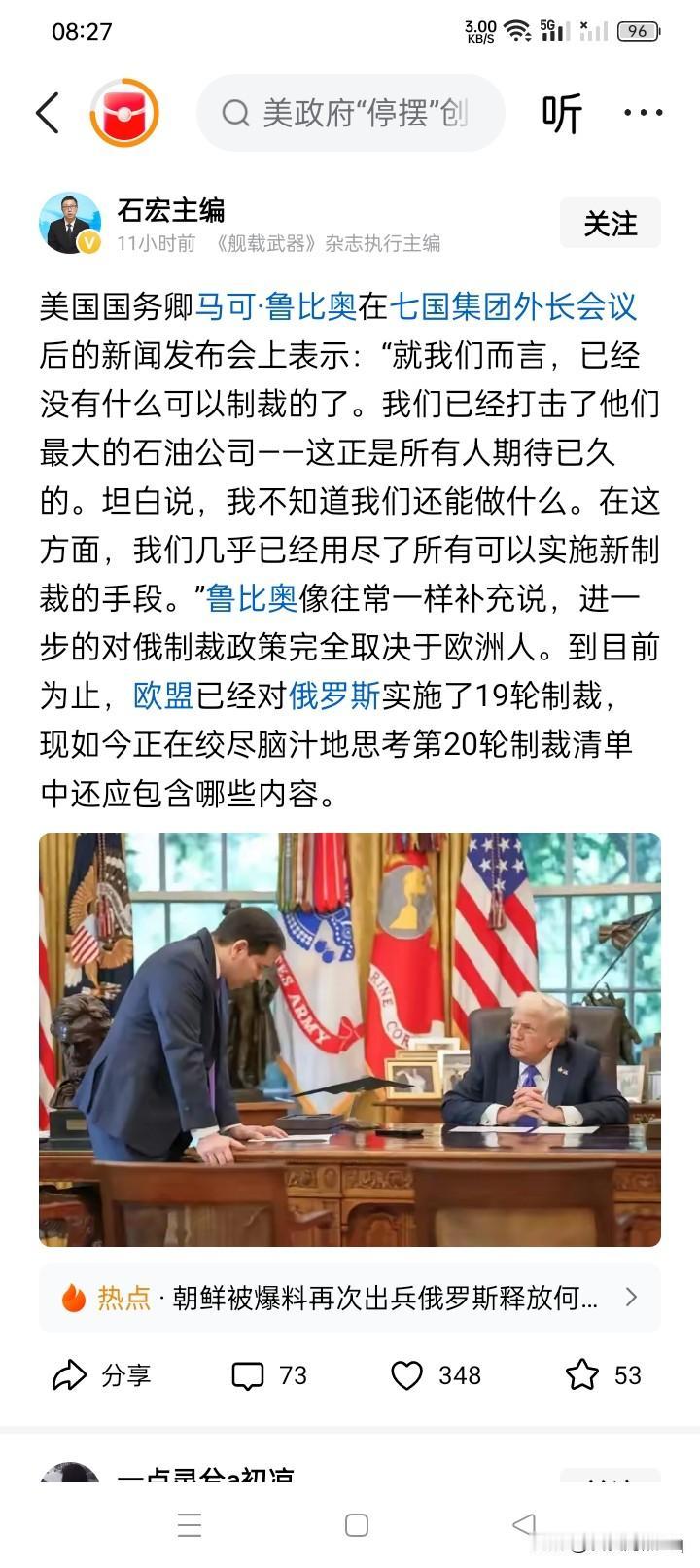 打大首领耳光吗? 记得以前大首领曾经说过(还可能是多次说过),美国制裁俄罗斯的办法有很多,如果俄罗斯不停止战争,他可以任意选项对让俄罗斯非常难受的、严厉的制裁措施。 然而,11月12日,美国国务卿卢比奥在加拿大参加七国集团会议后的新闻发布会上却出乎意料之外的表示:对于俄罗斯,我们已经没有什么可以制裁的了。我们已经打击了俄罗斯主要的石油公司,这使我们几乎已经用尽了所有的制裁方法。我不知道我们还有什么新的制裁的手段。这与大首领先前说过的话,截然不同,差距简直就是天壤之别,但却不知道谁说更可信。 卢比奥还说,如果要对俄罗斯采取新的制裁手段,只能是看欧洲人了。但是,欧盟好像绞尽脑汁,挖空心思,已经对俄罗斯进行19轮制裁了。虽然网络上有消息说,欧盟正在考虑对俄罗斯采取第20轮制裁,但确实搞不清楚俄罗斯还有什么可以制裁,欧盟又能进行什么样的制裁。