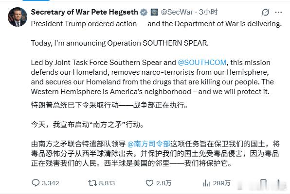 特朗普下令对委内瑞拉发起“南方之矛”行动!来源:SecWar