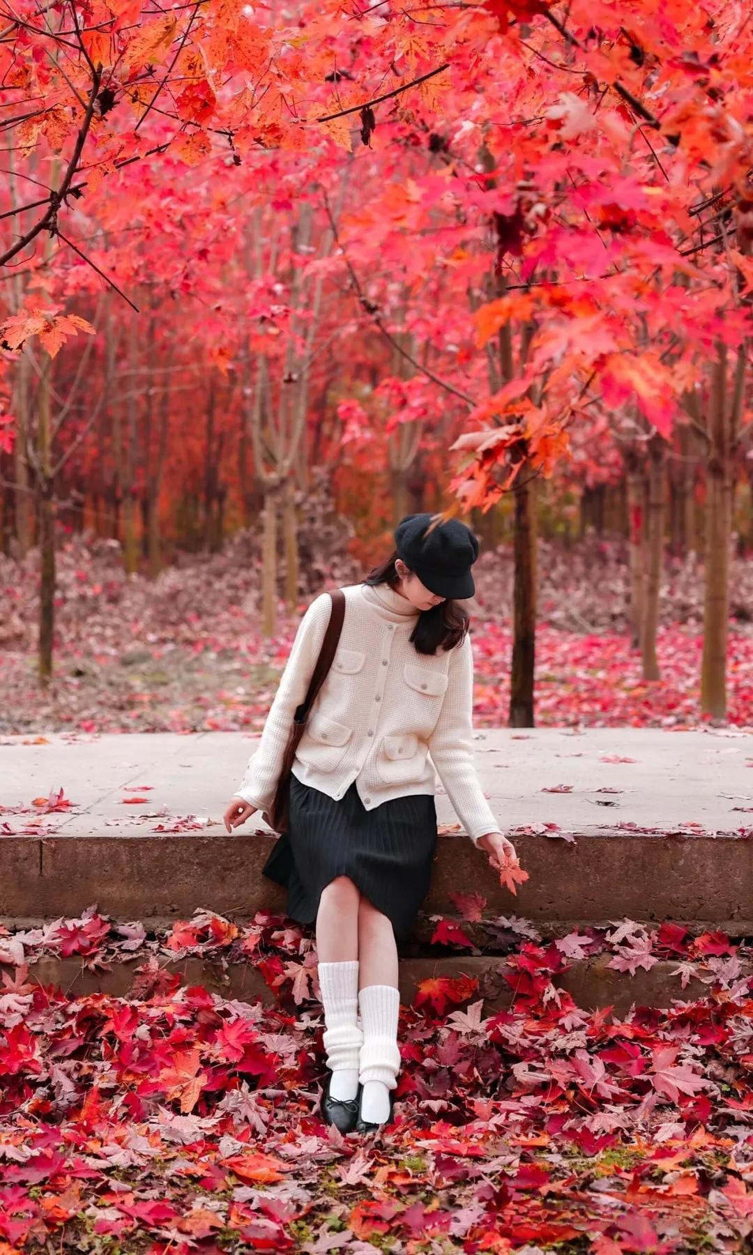 秋日暖阳下,红叶与黑裙相映成趣,时尚与自然完美融合。