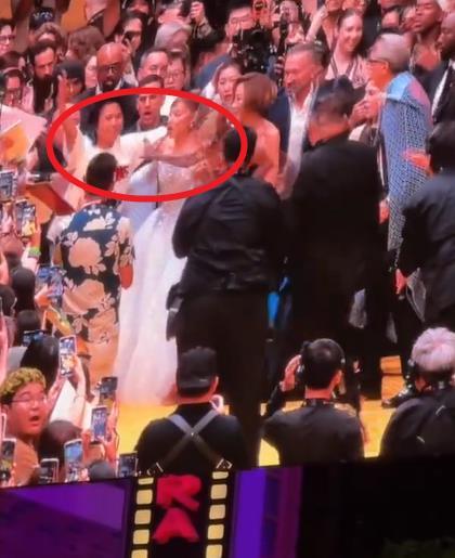 《魔法坏女巫2》新加坡首映礼,主演A妹爱莉安娜·格兰德和辛西娅·艾莉佛参加活动。一男子翻越围栏强行上前搂抱A妹,遭到一旁的辛西娅·艾莉佛推开,最后该男子被保镖带走。