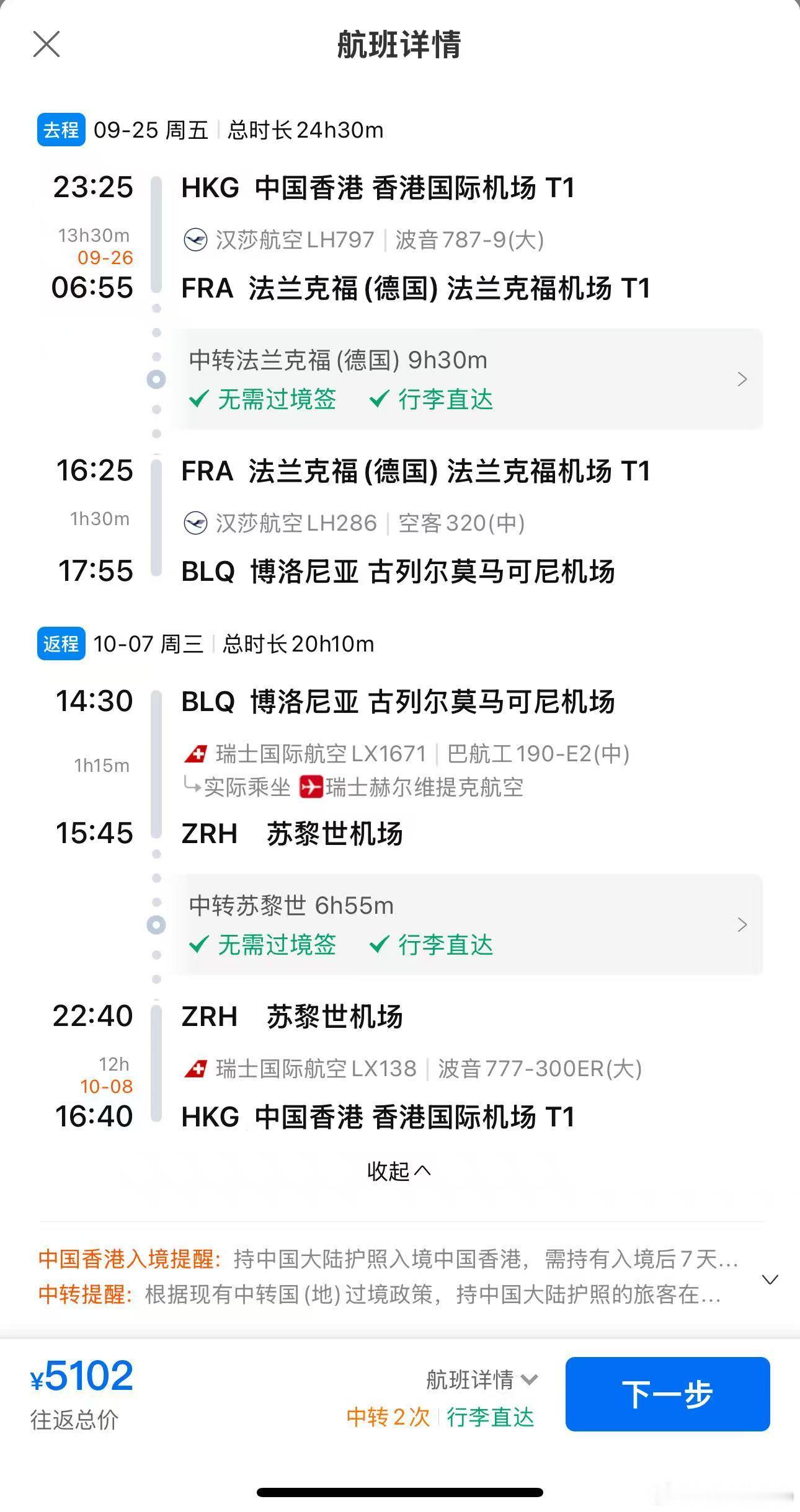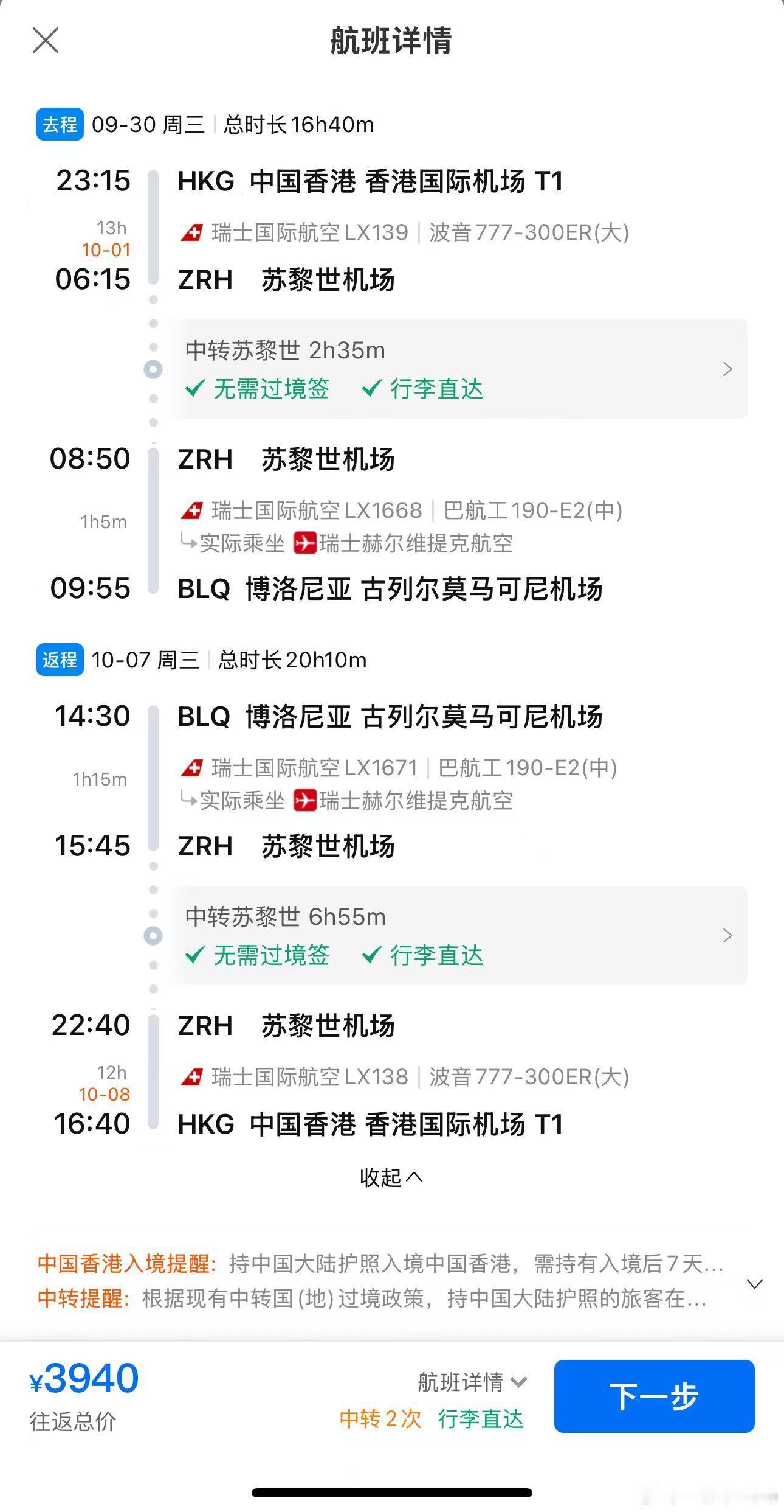 我丢?汉莎或者瑞士航空,明年国庆请3天休13天,香港往返博洛尼亚5100。如果晚几天等到9月30日出发,不请假,香港往返博洛尼亚就只3900了?感觉明年的观赛计划可以做起来了!?那我先去申请一个意签的多年多次往返去。