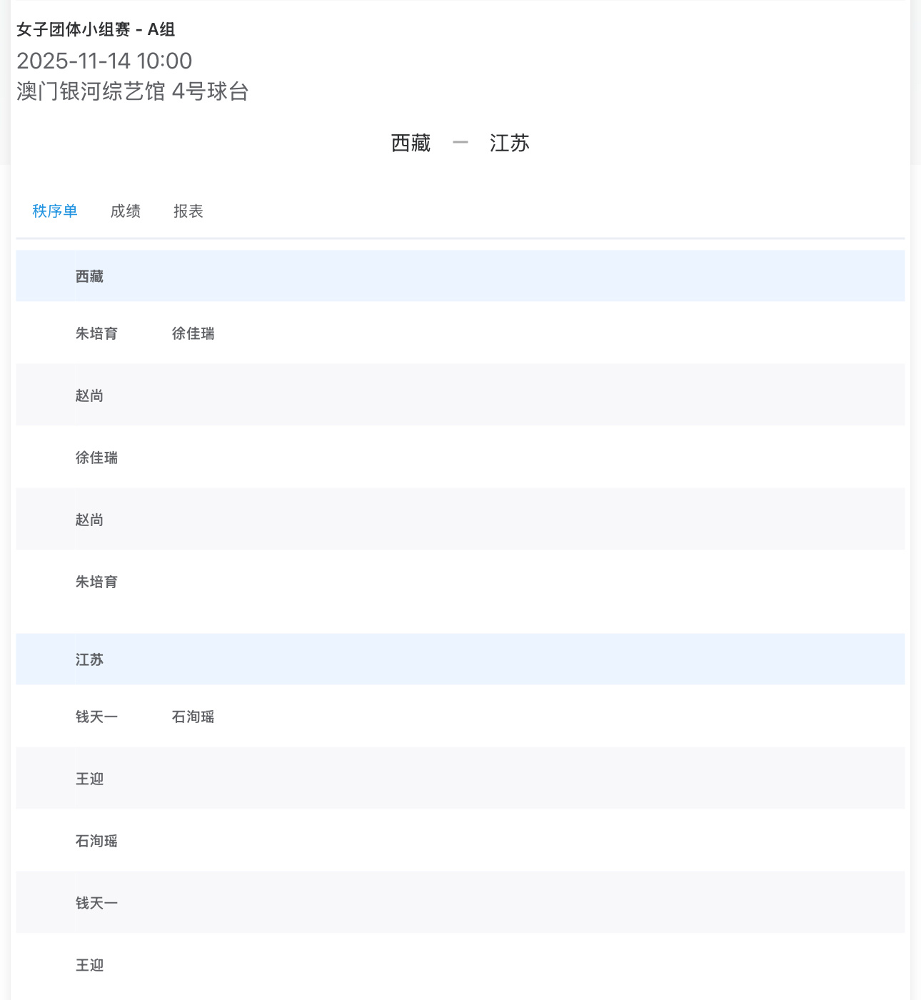 第十五届全运会乒乓球女子团体小组赛 - A组2025-11-14 10:00 4号球台【西藏vs江苏】朱培育/徐佳瑞vs钱天一/石洵瑶赵尚vs王迎徐佳瑞vs石洵瑶赵尚vs钱天一朱培育vs王迎