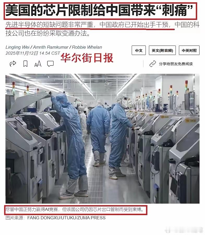 还在再夸大“刺痛” ,美国的“卡住中国”梦该醒了。《华尔街日报》昨天渲染美国芯片限制给中国带来“剧烈刺痛”,声称中国先进半导体短缺问题已到“必须紧急干预”的地步。不可否认,外部技术封锁确实给中国部分高端芯片领域带来短期挑战,但美国试图以此拿捏中国科技发展命脉、阻断产业升级进程的算盘,显然打错了,说中国很痛更是笑话。从产业基本面来看,中国芯片产业早已构建起多元韧性,所谓“全面封锁”不过是低估中国实力的一厢情愿的幻想。首先,美国人刻意夸大的高端芯片缺口,实则远非致命短板。在AI芯片这一关键领域,外界普遍认为中国依赖进口,但实际情况是,国内高端AI芯片供需基本平衡,缺口被严重高估。2025年中国AI芯片市场规模已突破千亿元,华为昇腾、寒武纪等企业通过架构创新与软件生态优化,在训练芯片、推理芯片领域形成差异化优势,部分产品能效比已接近国际先进水平,华为更通过集群技术在算力反超。当前中国AI产业的发展,更多是基于场景需求的技术迭代,而非对单一海外芯片的依赖,美国的封锁反而加速了国产AI芯片的规模化应用,所谓“卡脖子”并未击中要害。其次,中国中低端芯片的万亿出口体量,构筑起产业安全的坚实底座。美国只盯着高端芯片的短期限制效果,却忽视了中国在全球中低端芯片市场的绝对优势。2024年中国集成电路出口额达1595亿美元(约合1.1万亿元人民币),连续14个月保持增长,超越手机成为出口额最高的单一商品,出口量接近3000亿块;2025年则以20%以上速度增长。这些芯片以28纳米以上成熟工艺为主,广泛应用于汽车电子、工业控制、物联网等领域,凭借高性价比占据全球重要份额,不仅为产业发展提供了稳定现金流,更完善了从设计、制造到封测的全产业链协同能力,成为抵御外部风险的“压舱石”,乃至美国人都要靠关税壁垒和限制中国等不择手段伎俩来对抗中国芯片了。再次,PC与部分手机处理器的缺口,本质是选择偏好而非能力短板,替代切换早已箭在弦上。此前部分中国企业偏好使用美国处理器,更多是基于市场成熟度的商业选择和喜欢成为美国人芯片代理人,而非国产替代无路可走。随着美国封锁升级,国内产业链已启动全面切换,国产CPU逐步实现政企办公场景替代,手机处理器领域也开始实现全产业链自主可控。当外部供应不再可靠,国产芯片的市场空间被快速激活,这种“被动倒逼”反而加速了替代进程,所谓“缺口”正在被自主创新快速填补。另外,中国存储芯片的快速崛起与全球涨价周期,更让封锁失去意义。中国在存储芯片领域不仅产能继续快速成长,更在加速实现技术赶超。作为集成电路出口的主要品类,国产存储芯片已形成规模化产能,长储等企业的技术突破让中国在NAND闪存领域站稳脚跟、长鑫在运存也快速进入全球五强。当前全球存储芯片涨价是行业周期性现象,与中国产能无关,反而让具备自主产能的中国企业获得更大市场主动权。随着国产存储芯片在性能、成本上的竞争力持续提升,海外封锁对这一领域的影响已微乎其微。美国的芯片封锁,本质上是用单边霸权挑战全球产业分工规律,妄图用技术壁垒打压中国发展。但他们显然低估了中国产业升级的决心与韧性,美国人的卡脖子倒逼中国技术攻坚,市场需求牵引生态完善,特别降低国产设备和芯片进入产业链门槛、这反而是最难的点被美国人打掉了,中国芯片产业正在封锁中加速突围。美国以为一张芯片禁令就能卡住中国,最终只会发现,自己不仅没能阻断中国的发展,反而倒逼中国完成了关键技术的自主可控,失去了庞大的中国市场。