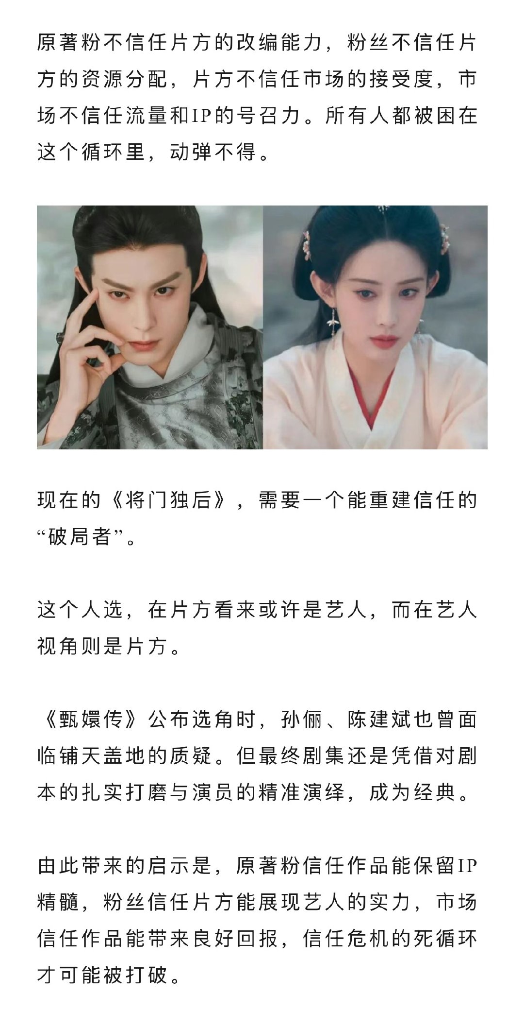 原著粉信任作品能保留IP精髓,粉丝信任片方能展现艺人实力,市场信任作品能带来良好汇报,才能真正实现信任循环。片方的左右为难、原著粉的过度警惕,本质上都源于对“好作品”的强烈期待。
