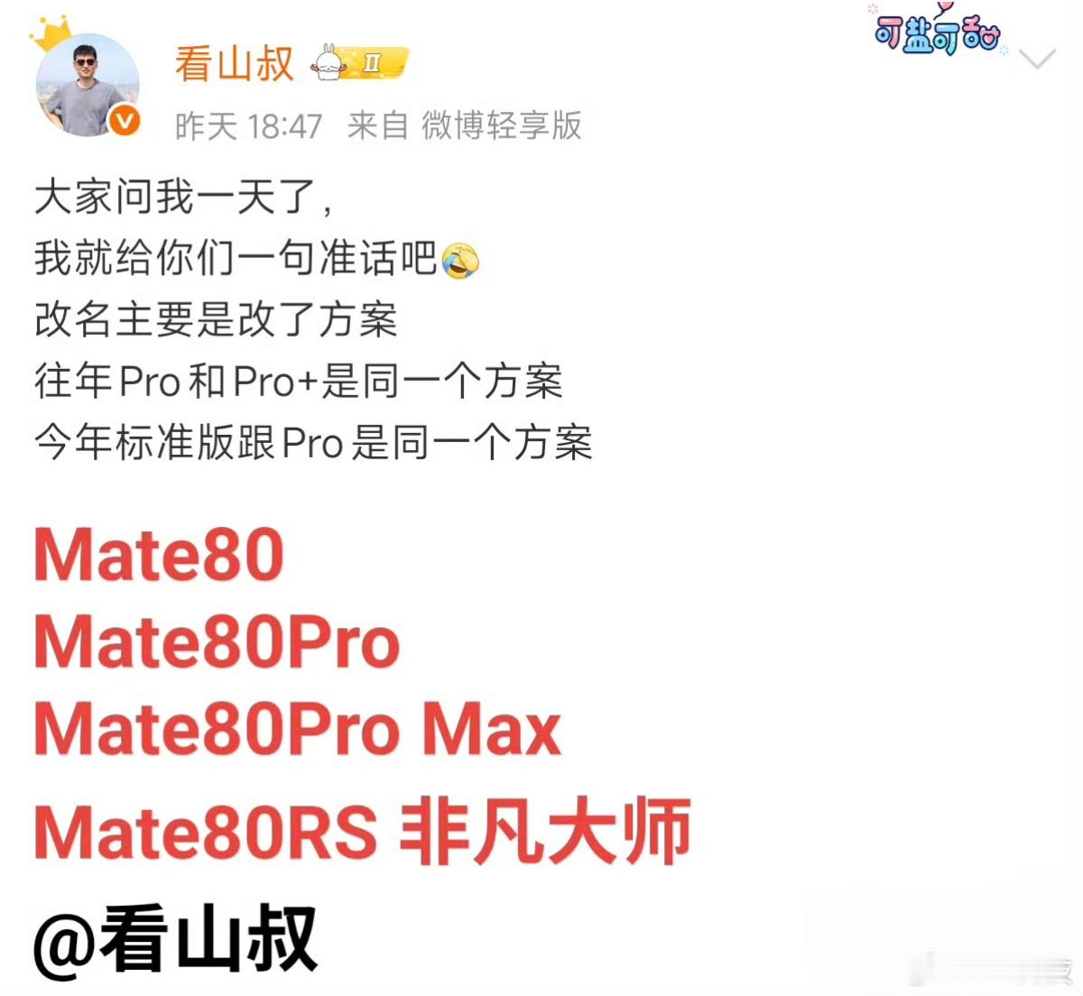 这次看点之一是改名啊,标准版、Pro、Pro Max,对标iPhone命名,当然还有RS非凡大师,大家怎么看?