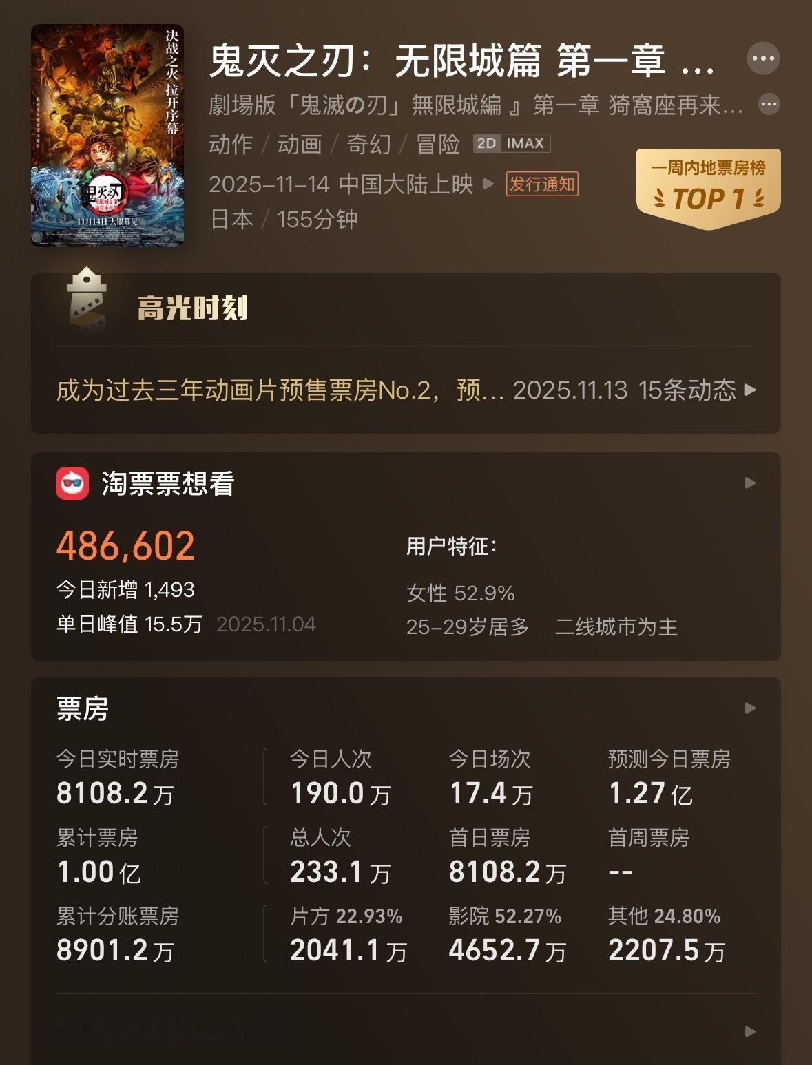 《鬼灭之刃无限城篇》零点上映,截至目前,累计票房破亿,预测今日票房1.27亿