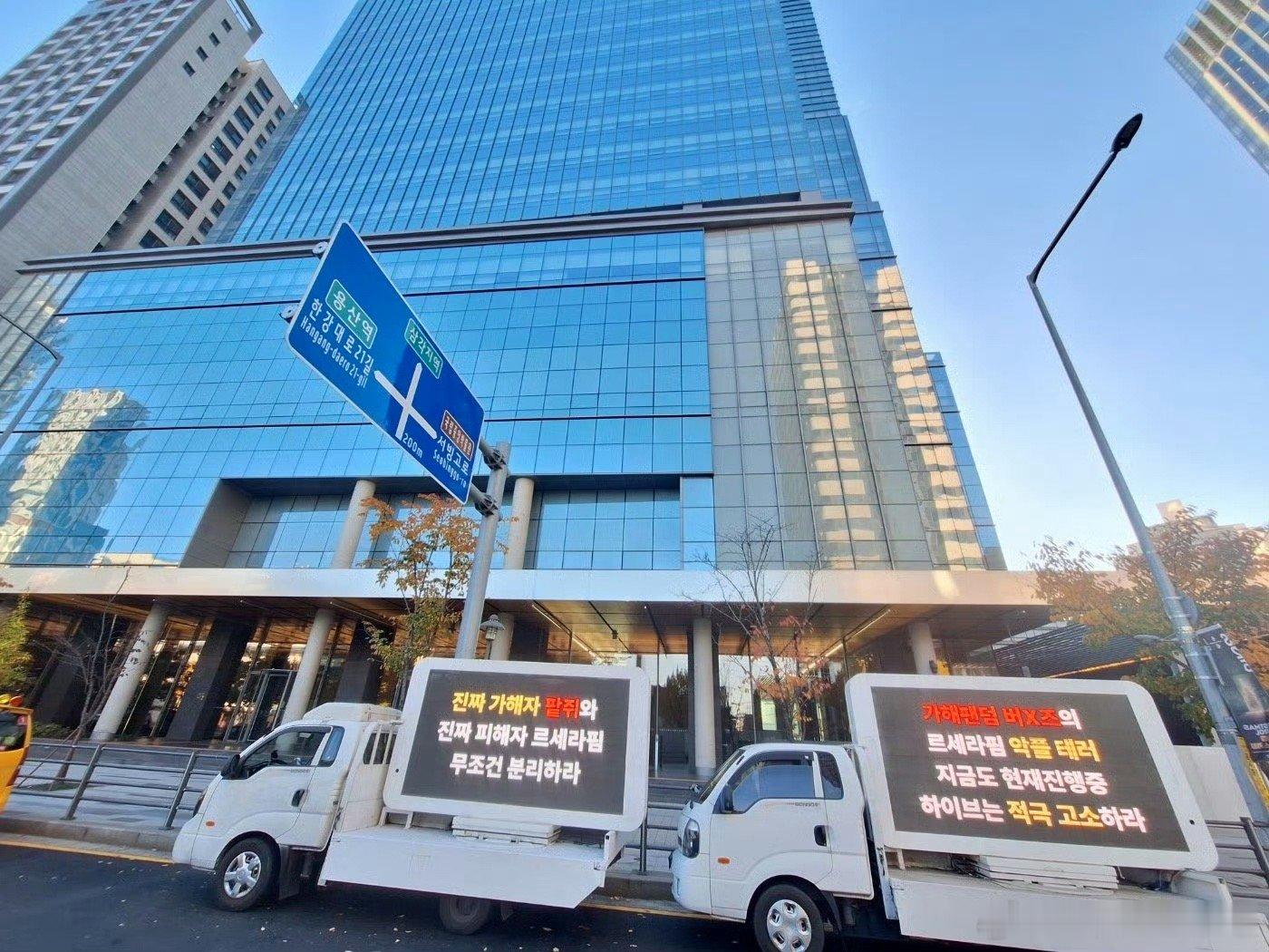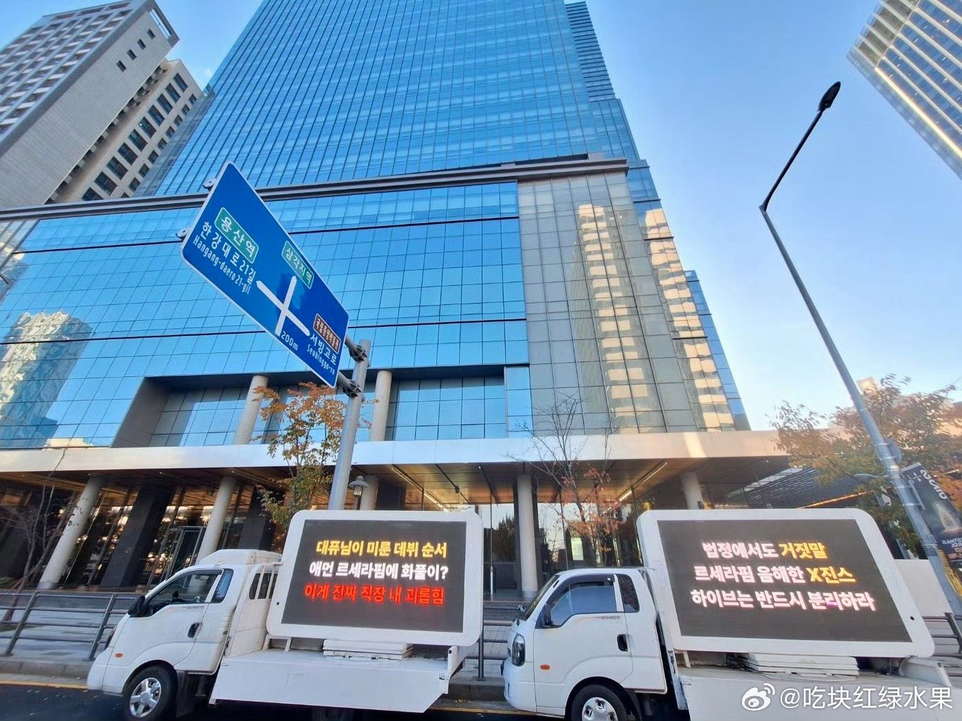 今日 在HYBE大楼前对NewJeans和闵熙珍卡车示威的LESSERAFIM粉丝
