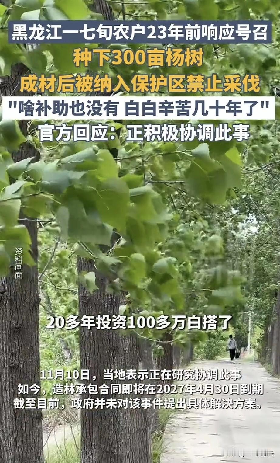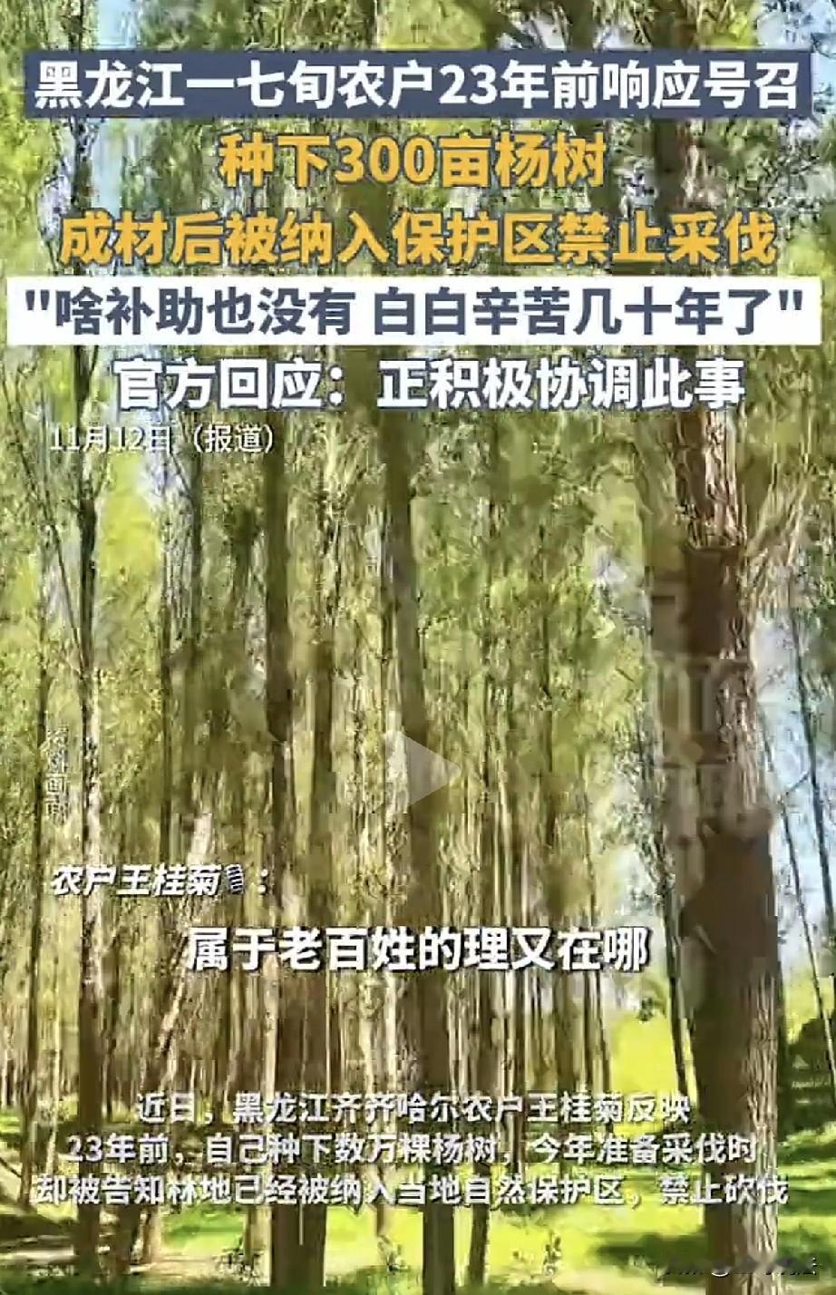 黑龙江齐齐哈尔,一48岁农妇响应号召,承包360亩荒地,种下万棵的杨树,她辛苦劳作,精心哺育,23年后,杨树长大成才,到了采伐时候,却被告知这片林地,被纳入自然保护区,禁止砍伐,此前,退耕还林补助一分钱没拿到,农妇已经71岁,她忍不住哭诉: 20多年,投资100多万,白搭了…… 2002年的时候,王桂菊只有48岁,为了响应号召,她一个人承包了360荒地。 她与村委签了《造林承包合同书》,合同规定,承包期25年,自2002年5月1日~2027年4月30日。 合同约定,合同期内林木成熟可以申请采伐,如果政.策调整,须收回承包土地时,应按有关规定给予补偿。 合同签好,王桂菊万分高兴,她立刻行动,从此开始了辛苦的劳作。 二十多年的时间,她几乎把家安在了林地里,她只有一个念头,一定要把这片山地,种出一棵棵参天大树。 她的所有希望和心血,全部都搁置在这360亩土地。 她每天天不亮就扛起了锄头,去荒地除草,树苗一棵棵种下,她又一棵棵育土施肥。 她夏天顶着日头,给树剪枝,冬天冒着凛冽的严寒,一遍遍的巡林防护。 她怕有人偷砍,也怕野畜对林子进行啃咬破坏,随着小树苗茁壮的成长,王桂菊脸上这才有了笑容。 王桂菊丈夫早亡,是她一个人守护着女儿,女儿当时还小,那时总跟着母亲在林子里守护树木。 母亲的手黝黑粗糙,全是一道道的裂口,指甲缝里嵌着洗不净的泥土,身上的衣服沾满了草叶和土地的味道。 日子一天天的过去,日子就这么往前苦熬,眼看着手指粗细的杨树苗,慢慢长成了胸径20到40厘米的大树。 合同里有提到,可以享受有关补贴的正策,但20多年过去,他们从未享受过任何的补贴。 这些年里,王桂菊没少往林子里投入,她购买树苗、雇人帮忙、添置管护工具,前前后后花了一百多万。 王桂菊看着一天天长大的树,又觉得等采伐了,一切都值了。 2024年,树木终于到了最佳采伐期,王桂菊让女儿张丽去办理采伐证。 这个时候,让母女俩始料未及的事儿发生了。 工作人员告诉她们,这片林地被划入自然保护区缓冲区,按照规定,保护区里的林木禁止采伐,她们的申请被相关部门拒绝。 张丽拿着二十多年前的合同,愣在原地,她反复跟工作人员说,种树的时候这里还不是保护区,合同里明明写着可以采伐,怎么说不让伐就不让伐了? 张丽拿着合同,为母亲的付出,心痛至极,既然不让伐木,就应该给予相应的补偿。 可工作人员回复,这片地属于“三北”工程造林地,不能享受退耕还林补贴。 张丽不服气,申请相关部门信息公开,但以涉密为由,被拒绝了。 她又向林草部门申请复查,得到的回复还是一样:没有相关补贴,也没找到林地划入保护区后给予补偿的政策规定。 这时候的王桂菊已经71岁,常年的劳累让她患上了多种疾病,身体大不如前。 二十多年的心血,一百多万的投入,眼看就要有回报,却被禁止采伐这盆冷水,从头浇到了脚下。 除了十多年前大水后倒伏的树木被批准砍伐,卖了几万块钱,这片林子几乎没给她带来过任何经济效益。 她站在自己亲手种的树林里,看着枝繁叶茂的大树,忍不住抹着眼泪。 王桂菊抬起头来,细碎的阳光落在她的身上,她看着参天的大树,树木成林,绿意盎然,树叶沙沙的响着。 王桂菊心里高兴,树木长这么大,她的辛苦培育没有白费。 可是她又想起来自己二十多年的付出,如今禁止采伐,投入不能获得回报,她又忍不住心酸落泪。 王桂菊心如刀割,声音哽咽: 收回去也行,你也得给我们钱啊,这一分钱没看着,不就白养活这么大了吗? 她辛苦二十多年,补助啥也没有,早知道如此,干点啥都不行吗?二十多年的时光,占去她最好的人生阶段,如今全都白费。 相关部门做出回应,正在积极协调,想通过用村里的集体林权和张丽互换部分林权。 可张丽觉得,这样不行,树的粗细、树龄、林地面积都没法精准匹配。 如今,距合同到期只剩2年,王桂菊已经不知道自己还能做些什么。 那些高大的杨树,曾经是她的希望,现在却成了压在她心头的石头。 她不知道这件事最后会怎么解决,只盼着能有个公平的结果,让她二十多年的辛劳不至于白费。 《民法典》第533条规定: 合同成立后,客观情况发生当事人在订立合同时无法预见的、不属于商业风险的重大变化,继续履行合同对于当事人一方明显不公平的,受不利影响的当事人可以与对方重新协商;协商不成的,当事人可以请求法院或者仲裁机构变更或者解除合同。 王桂菊承包的林地被划入自然保护区属事后重大调整,系订立合同时无法预见的情形,王桂菊可请求解除合同,并要求按合同约定及林木实际价值获得补偿。 王桂菊对林地享有合法承包经营权,林地因生态保护被限制采伐,实质影响用益物权行使,相关部门以无政策规定拒付补偿于法无据。 关注@王哥说法 多学法律少吃亏!
