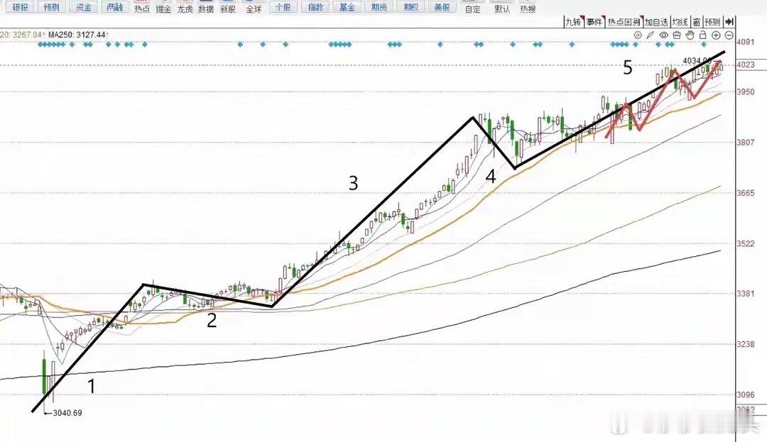 午评: A股早盘创新高,但创指深指调整,莎莎说接下来或以退为进上午收盘了,市场的指数基本上还同莎莎预判的一样。上证指数低开走高,目前呢走了一颗假阳线的走势。截止上午收盘微跌0.16%。但是创业板指调整的比较深创业板指跌1.74%,深证成指跌1.1%。创指深指调整的原因主要来自于昨天晚上外围科技股大跌的影响。今天A股相关板块也受到了一定的拖累。那么接下来A股到底怎么走的问题?还会继续往上走吗?或者说这个位置短线需要休息一下了呢?在这里莎莎明确观点,接下来市场或者会这样走:莎莎认为从市场指数的走势来看,上证指数接下来回到箱体低点的概率相对较大。箱体低点,上周星期三的低点3922点附近,离当前的点位其实是很接近的。那为什么我看市场会走箱体走势呢?大家只要看2幅图就很清楚了。第一,上证指数大周期5浪结构里面,还有小周期的第5浪。大家请看图一,上证指数从本轮的最低点304 0点开始,到今天的最高点4034点已经完成了一个非常清晰的日线级别大五浪结构。而在最近一段时间,我们又发现一个日线级别小五浪的结构。五浪结构的完成,都说明市场指数要进入到调整阶段。第二,从图二上证指数最近上涨的规律来看,每一个上涨波段,用的时间都是7个交易日或者8个交易日的样子。那么我们可以发现,从最近一个上涨波段低点到高点,已经完成了第8个交易日。所以接下来市场调整的概率相对是偏大的。所以综合以上两幅图,我相信大家就明白为什么接下来指数震荡回落,走箱体的概率是比较大的。当然这里呢大家也不用过度的担心,莎莎刚才讲到了市场指数大周期的上涨逻辑是没有改变的,大周期的上升趋势依然还在。只不过就眼下,就当下的情况来看,这个位置是需要一次技术性的调整。并且,昨天晚上外围市场出现了大幅度的调整,这是符合我的预判的。而且莎莎观察察,接下来美股可能还会有继续下行的动作。我们看到昨天晚上美股的调整,对A股今天早盘的开盘以及科技板块造成了明显的短线拖累。所以假设我对于外围市场的判断是成立的话,那么接下来市场指数短线可能还会受到外围市场的影响。所以综合以上种种情况分析,我们就不难得出结论,这个时候主力“以退为进”可能会更好一些。中午收盘和大家说到这里,大家点赞,评论➕关注就是对莎莎这个纯技术派的最大支持。