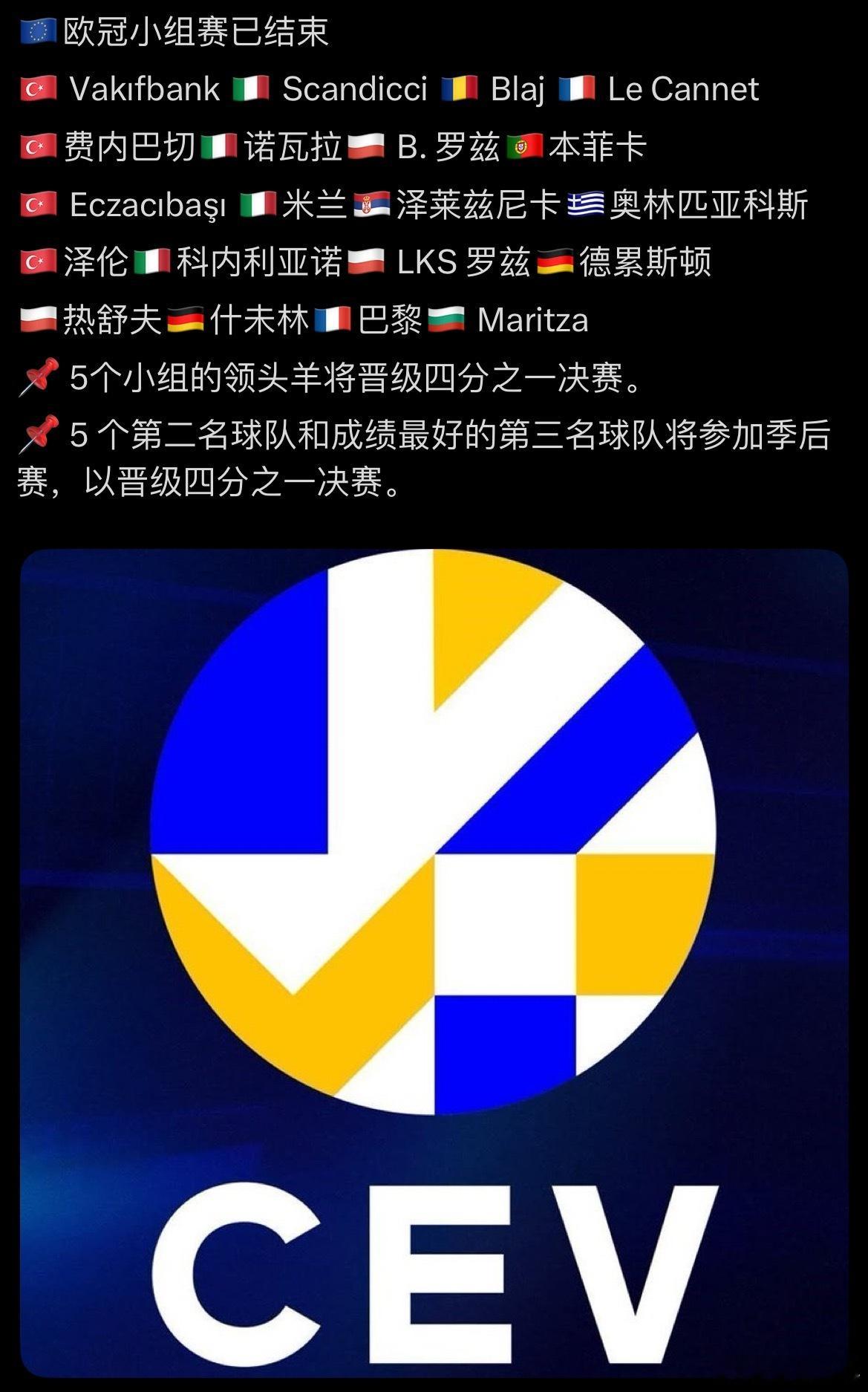 【25-26赛季欧冠女排小组队伍全部出炉】A组:🇹🇷瓦基弗银行、🇮🇹斯坎迪奇、🇷🇴布拉日、🇫🇷勒卡内;B组:🇹🇷费内巴切、🇮🇹诺瓦拉、🇵🇱罗兹建设、🇵🇹本菲卡;C组:🇹🇷伊萨奇巴希、🇮🇹米兰、🇷🇸泽莱兹尼卡、🇬🇷奥林匹亚科斯D组:🇹🇷泽仁体育、🇮🇹科内利亚诺、🇵🇱LKS罗兹、🇩🇪德累斯顿E组:🇵🇱热舒夫、🇩🇪什未林、🇫🇷巴黎圣云、🇧🇬普罗夫迪夫五个小组第一率先晋级八强,每个小组主客场决出名次!