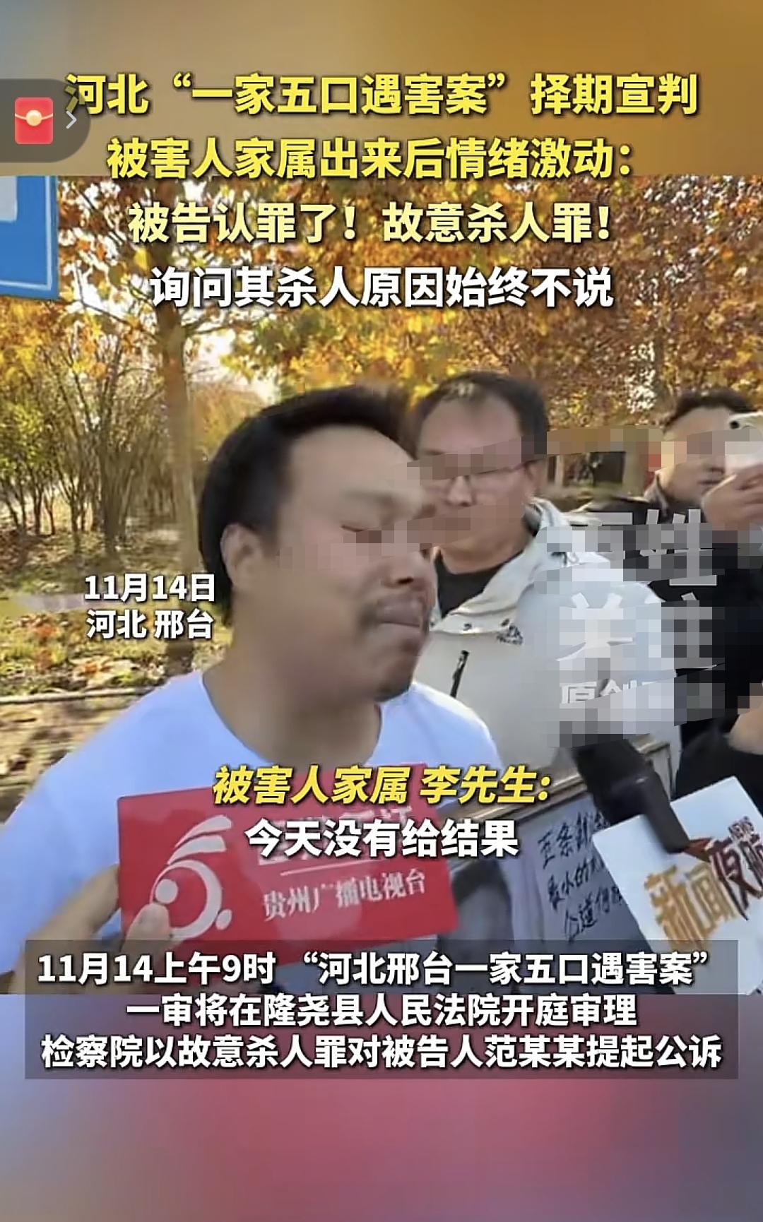 河北一家五口案,受害者家属李先生有些激动,他(范某)认罪了! 我们问他“我们家有没有占你的地”? 范某“没有” “那为什么要s害我们一家五口人”? 范某不做声,低头沉默,一直不说 案件最终也是判定择日宣判 李某家3名亲属旁听,4个小时的庭审过程,范某在庭上未做任何辩解,他只称自己“后悔了” 被告范某与任何家属到庭 他们家人应该也不理解他的这个做法吧?
