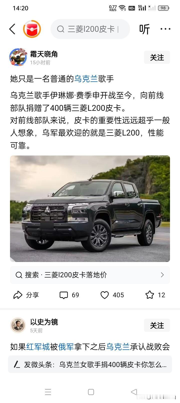 400辆三菱L皮卡! 自从俄罗斯对乌克兰的战争开始以来,仅仅是一个乌克兰女人伊琳娜·费委申,就向前线的乌克兰军队捐赠了400辆日本产三菱L皮卡。她可不是什么富豪大贵之人,她仅仅是乌克兰一个普通的女歌手。 一辆三菱L皮卡大约20多万人民币,400辆三菱L皮卡的价值差不多上亿人民币,可见爱国之心如同旭日昭然若揭。 至少,她不像某些闻名于世的砖家,以爱国之名自据,将勇于、善于反帝为名,大肆炒作并且捞钱,然后又到帝国买房置产,甚至是逍遥自在。