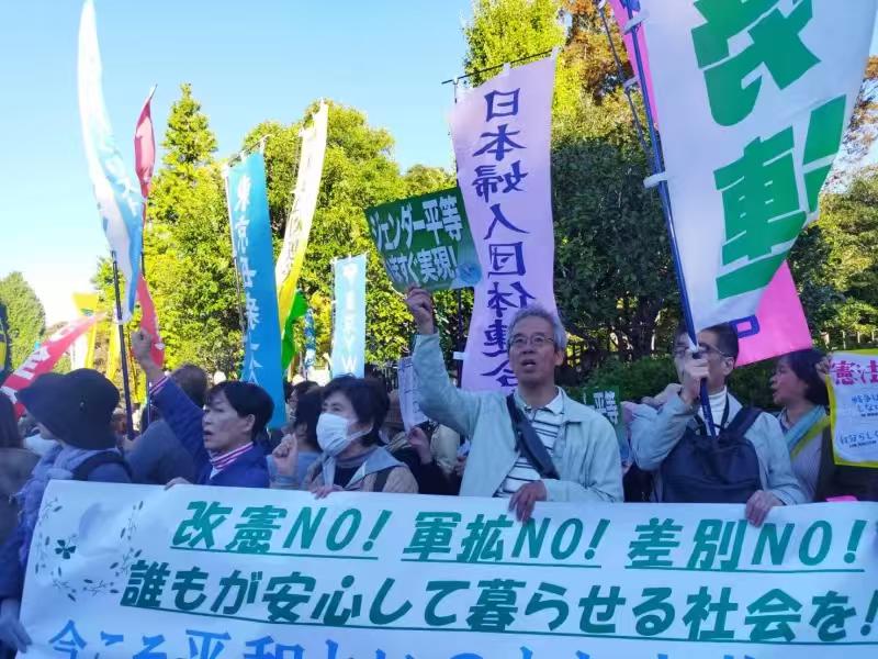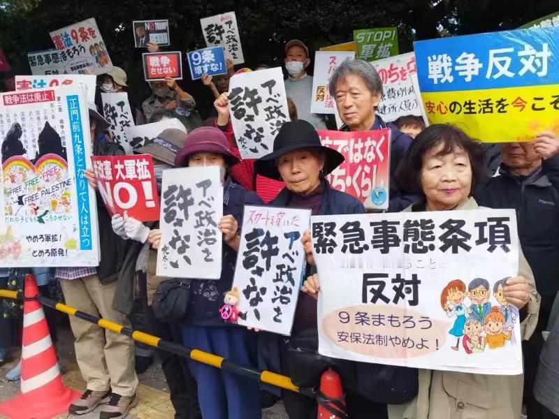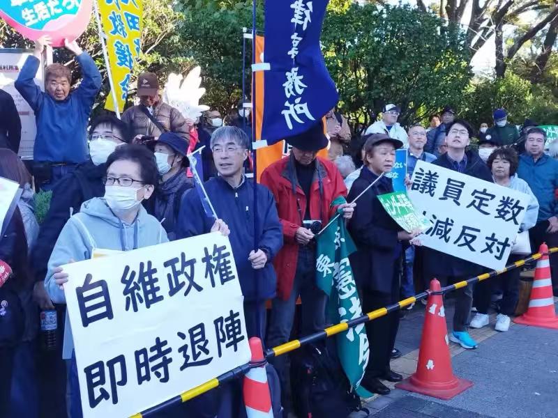 日本共产党的支持者在日本国会前集会抗议,祝愿高市早苗内阁早日垮台!