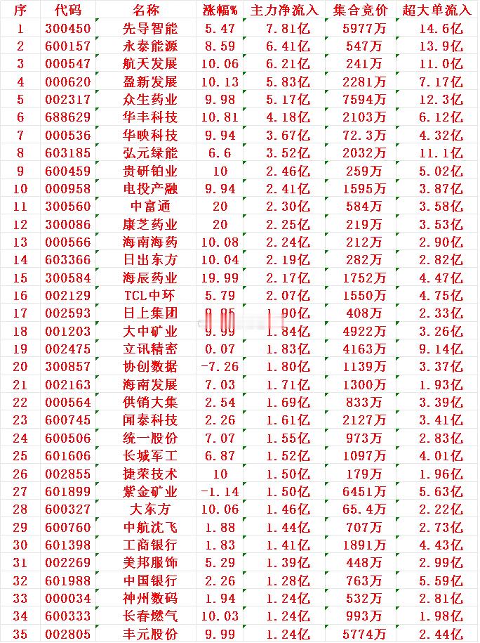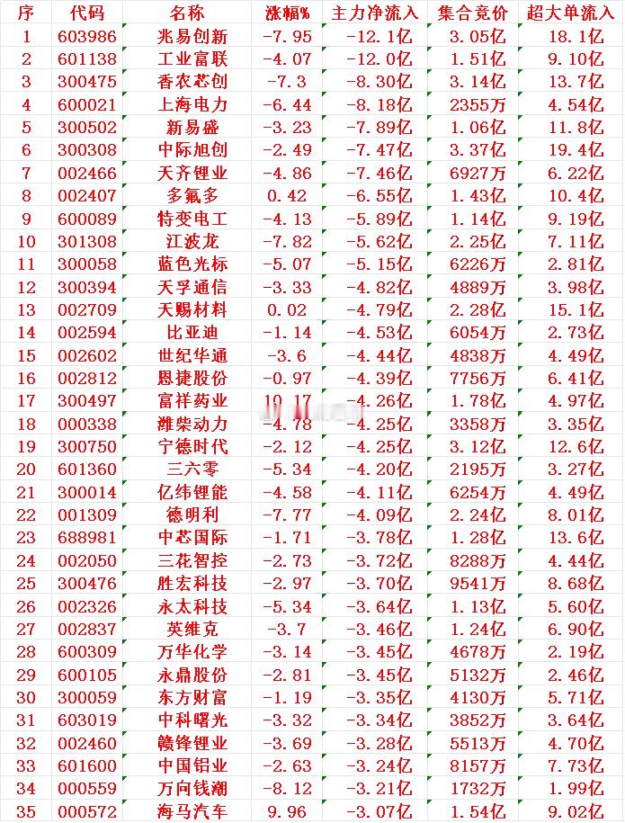 11月14日上午盘,主力趁低位,大幅买入的35名单先导智能:涨幅5.47%,资金净流入7.81亿元;永泰能源:涨幅8.59%,资金净流入6.41亿元;航天发展:涨停(涨幅10.06%),资金净流入6.21亿元;盈新发展:涨停(涨幅10.13%),资金净流入5.83亿元;众生药业:接近涨停(涨幅9.98%),资金净流入5.17亿元。11月14日中午收盘,主力资金“大幅卖出”的35名单:兆易创新:下跌7.95%,资金净流出12.1亿元;工业富联:下跌4.07%,资金净流出12.0亿元;香农芯创:下跌7.30%,资金净流出8.30亿元;上海电力:下跌6.44%,资金净流出8.18亿元;新易盛:下跌3.23%,资金净流出7.89亿元。