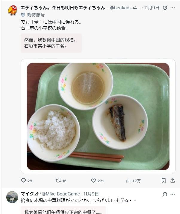 由于高市早苗的涉台言论在日本国内引起巨大议论,一开始有82%的网民支持高市早苗,但在特朗普明确表达站在中国这一边后,日本网上舆论突然反转,网友纷纷骂高市太鲁莽。 有意思的是在这场争论中有个帖子贴出中国学生排队打饭的照片,本来是想嘲笑咱们校服土气,结果评论区彻底跑偏。大伙儿盯着餐盘里的菜挪不开眼,三四个荤素搭配的菜品加上随便添的米饭,直接把日本网友看破防了。 现在日本超市大米价格翻着跟头涨,政府连粮食券都搞出来了,买袋平价米得像几十年前那样凭票供应。 回头看看他们自己的学生午餐,当年被捧上天的“营养典范”现在简直没眼瞧。清汤寡水的分量配上单调的菜式,搁咱们这早被家长投诉到教育局了。 其实看看这两年中日青少年身高变化就明白,日本年轻人平均身高连年缩水,咱们国内初中生窜到一米八的满操场都是。 虽说总有人吐槽学校食堂,但绝大多数学校确实在认真搞营养配餐,至少保证孩子能吃饱吃好。反观日本那些所谓“健康餐”,放咱这儿可能连喂鸡都嫌寒酸。 更扎心的是有日本网友翻出资料,发现他们午餐补贴资金连年削减,难怪孩子只能啃小半碗乌冬面。 这种对比背后藏着两国对下一代投入的真实差距,咱们再吐槽食堂也比他们那种敷衍强。现在日本网络到处是羡慕中国学生餐的留言,有人自嘲说终于理解为什么动漫里总画中华料理发光了。 各位读者你们怎么看,欢迎在评论区讨论。
