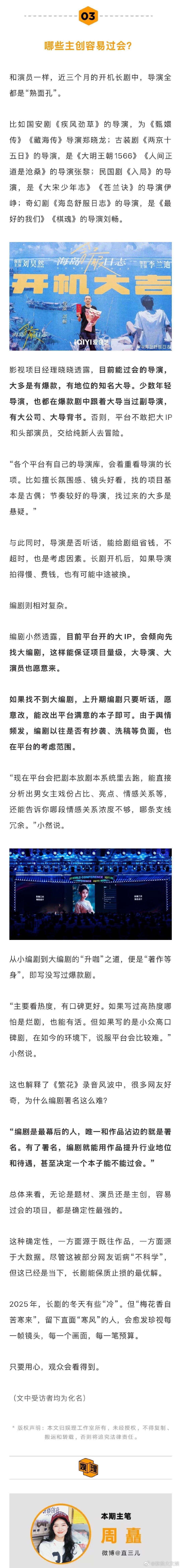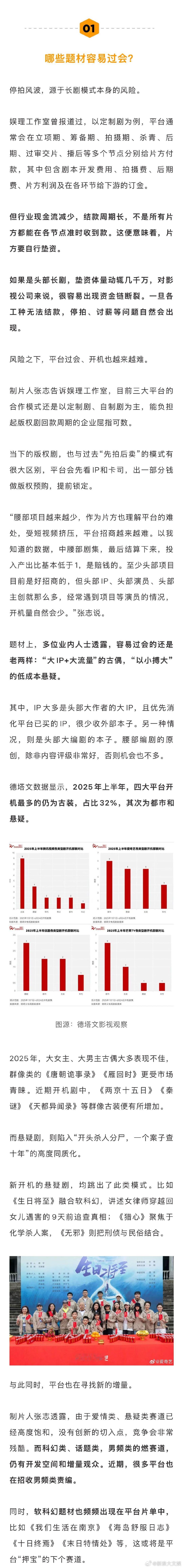 《江山为聘》《风月不相关》等剧集引发的停拍风波,源于长剧模式本身的风险:行业现金流减少,结款周期长,不是所有片方都能在各节点准时收到款,这意味着片方要自行垫资。如果是头部长剧,垫资体量动辄几千万,影视公司很容易出现资金链断裂。一旦各工种无法结款,停拍、讨薪等问题自然会出现…↓