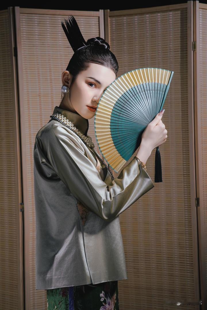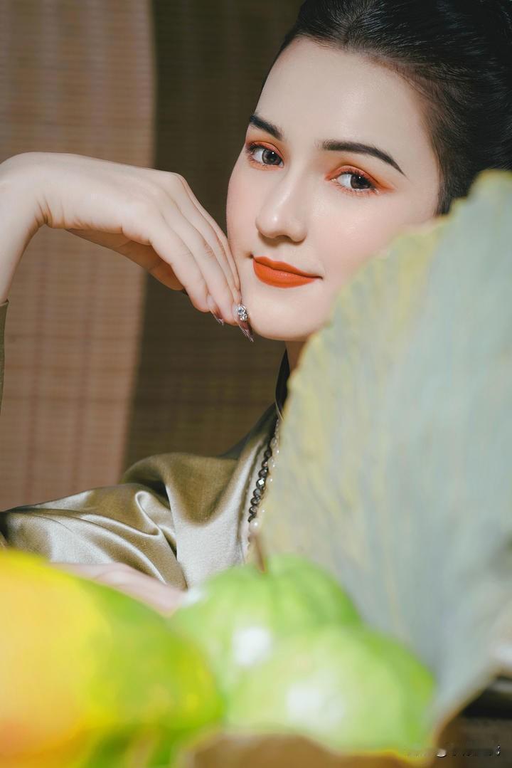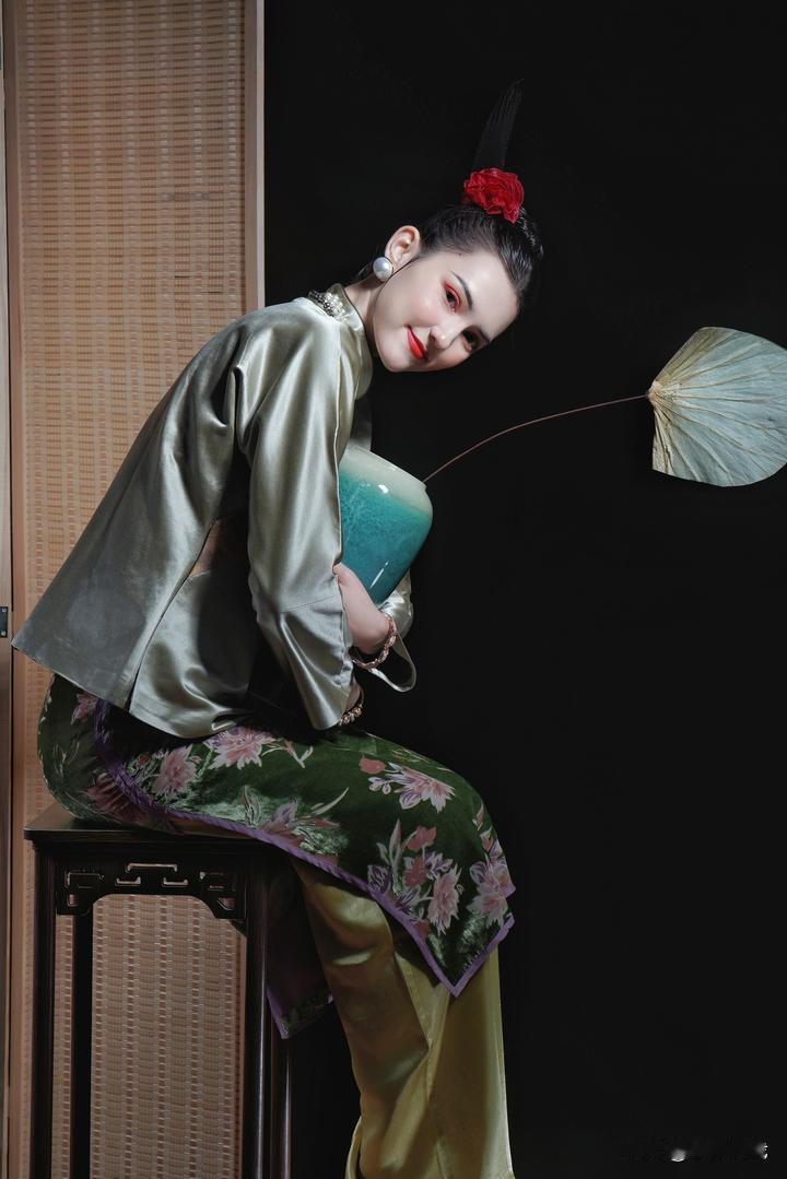 黛发簪朱红,绫罗裹月痕。 荷衣半掩春山面,腕底珠光浸旧温。 团扇遮眉,瓷瓶簪叶, 是江南古意里,偷藏的一帧鲜活。
