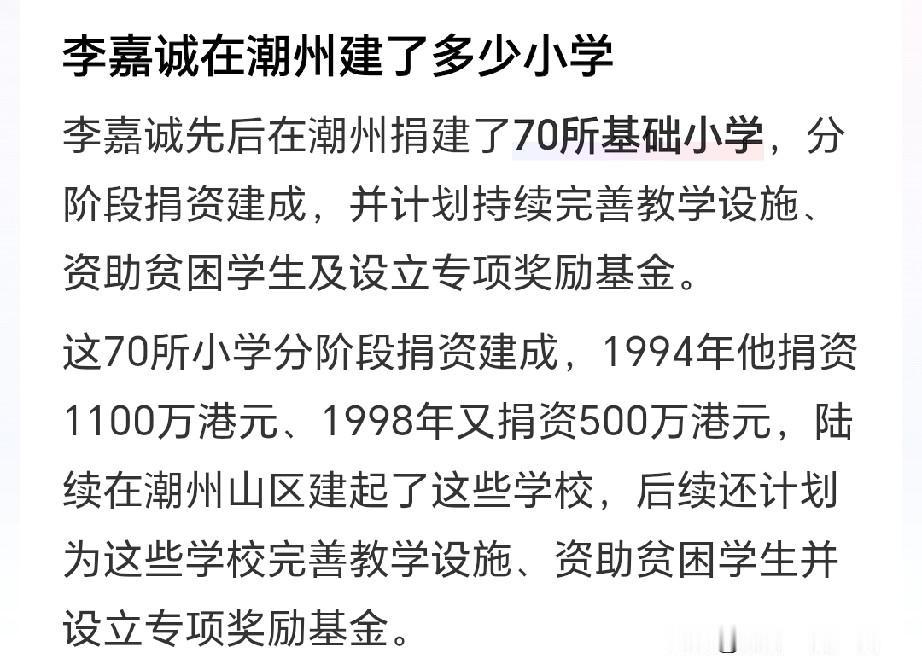 潮州该不该给李嘉诚建纪念馆 韩愈在潮州为官8个月,整个潮州江山就改姓韩。李嘉诚80年代底就为潮州建了70所小学,还有医院跟大桥。难道配不上一个纪念馆。当然李嘉诚自己可能也不愿意🈶这样一个纪念馆,他从来都不求这些。他明白树大招风,树欲静而风不止。 穷则独善其身,达则兼济天下! 商人赚了国家红利钱,难道政治家贡献不是用了国家赋予的权利。