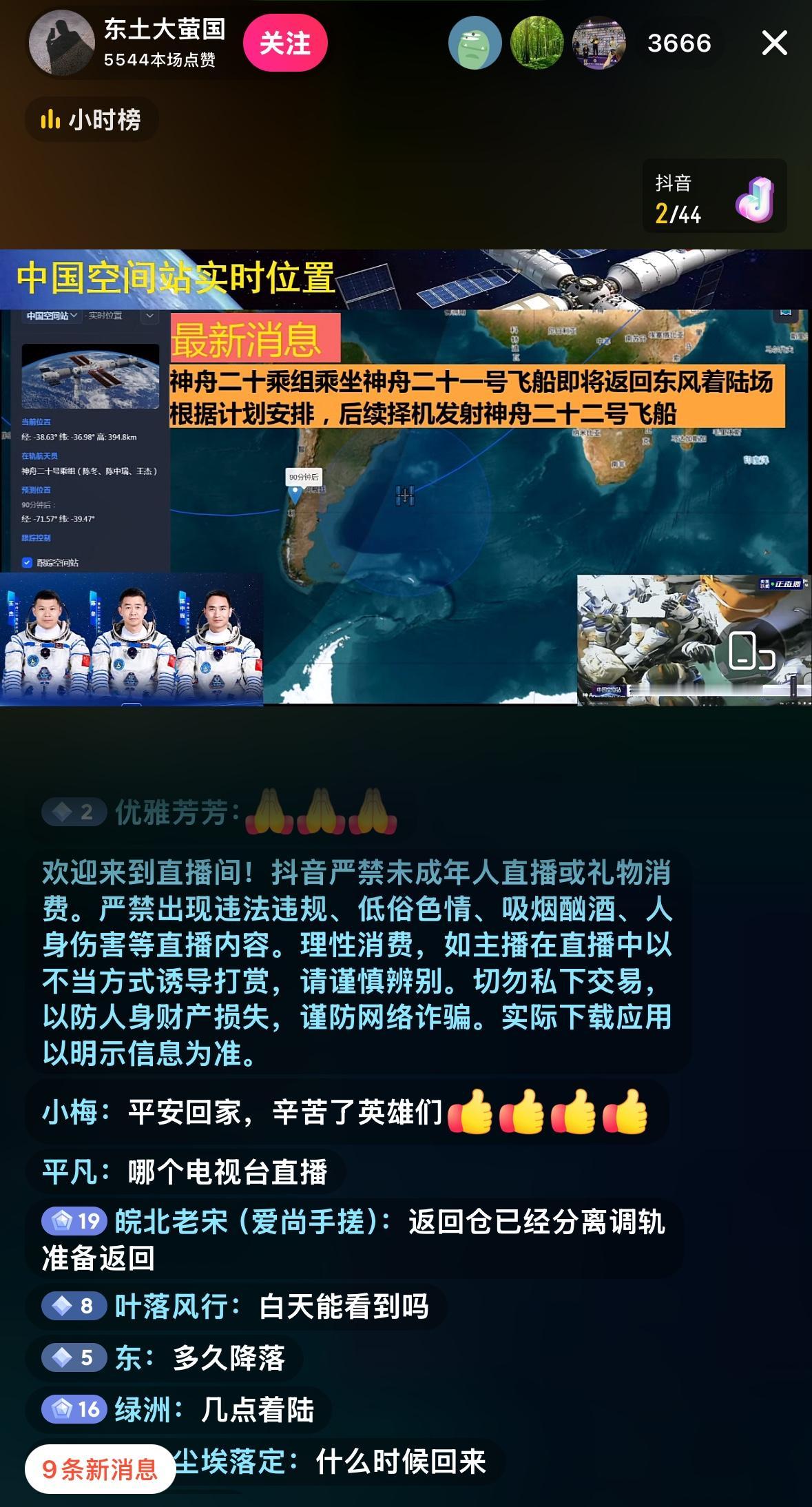 直播开始了,现在神20乘组应该已经进入神21飞船,即将和空间站脱离,下午四点多就要到家了,祝宇航员平安回家,祖国万岁![祝福]神舟二十一号