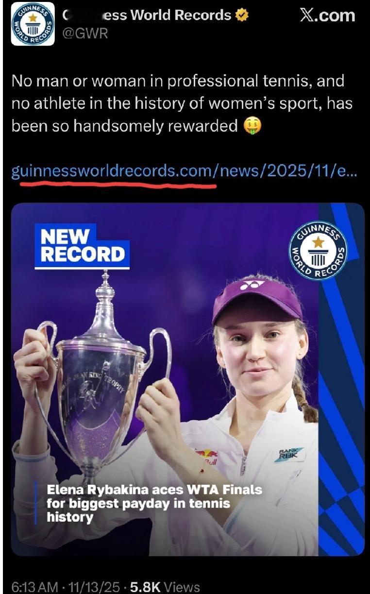 莱巴金娜年终总决赛所获得的523.5万美元巨奖创造了吉尼斯世界纪录! 吉尼斯官方全文:在职业网坛,无论男女,乃至整个女子体育史,都没有哪一个运动员曾获得过如此丰厚的回报! 更主要的是,莱巴这次获得奖金的所在地沙特,是不用缴纳高额的税费的。所以说,这500多万美元的奖金可以说是悉数进入了莱巴的腰包。这方面,即便是本年度正在举行的ATP都灵年终总决赛上,阿卡和辛纳以全胜战绩夺得总冠军,他们可以拿到的奖金也没有莱巴多。
