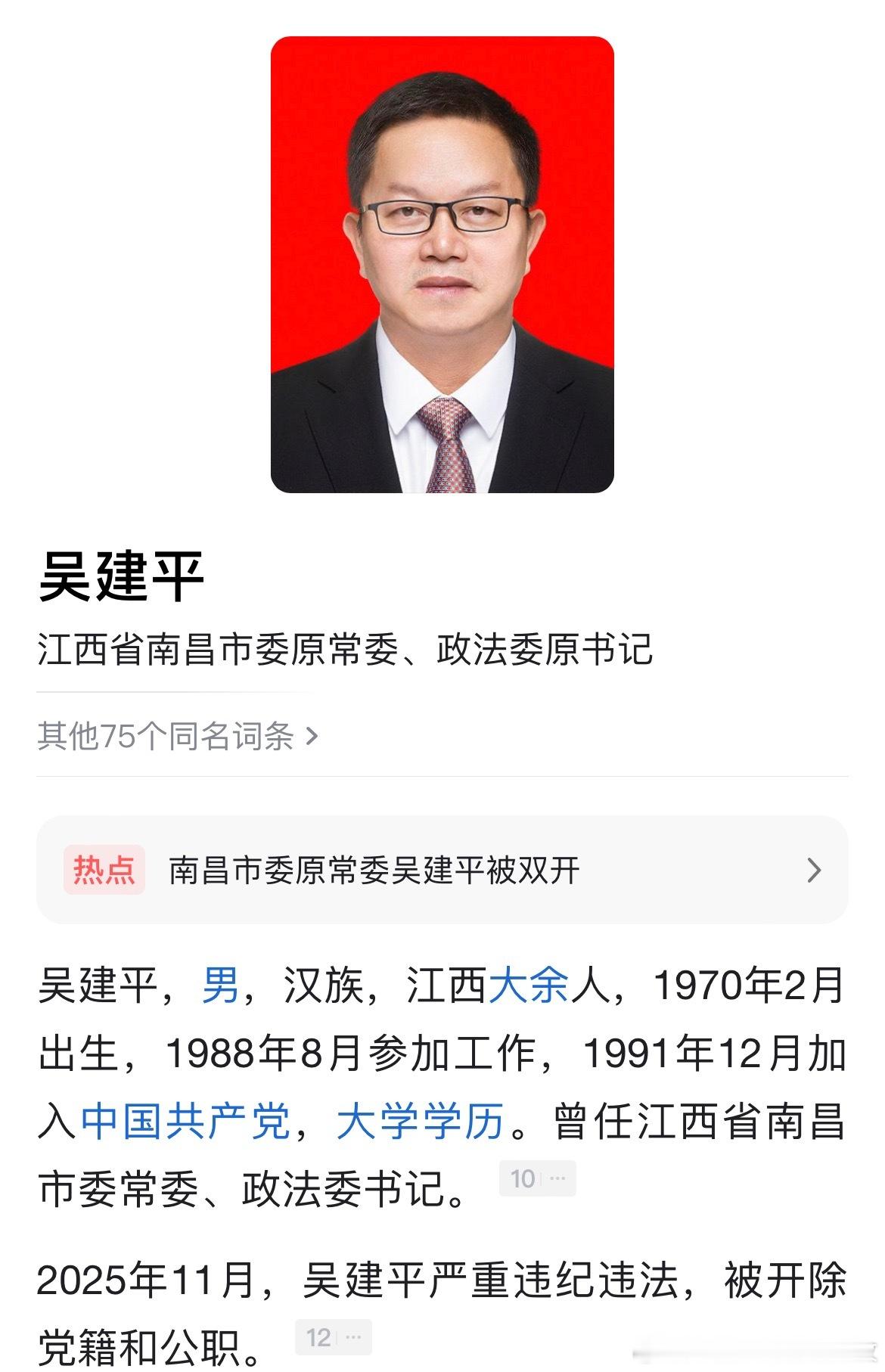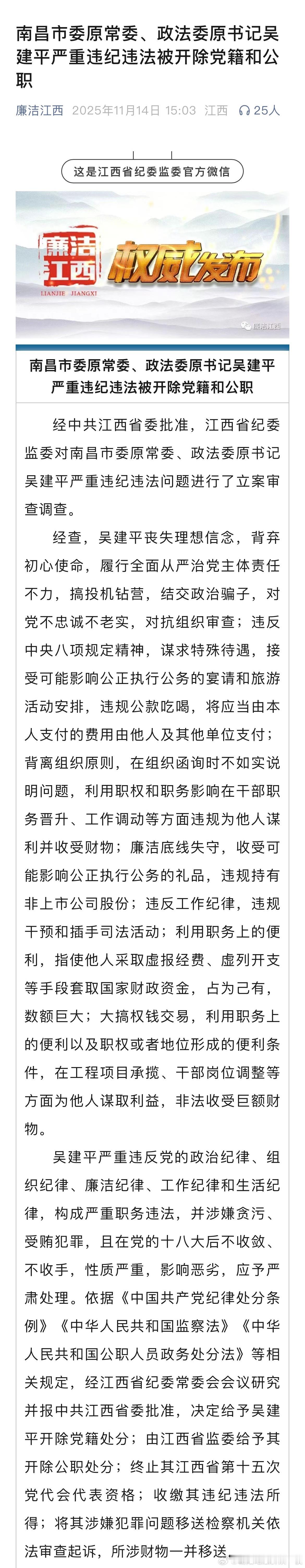 南昌市委原常委、政法委原书记吴建平严重违纪违法被开除党籍和公职!