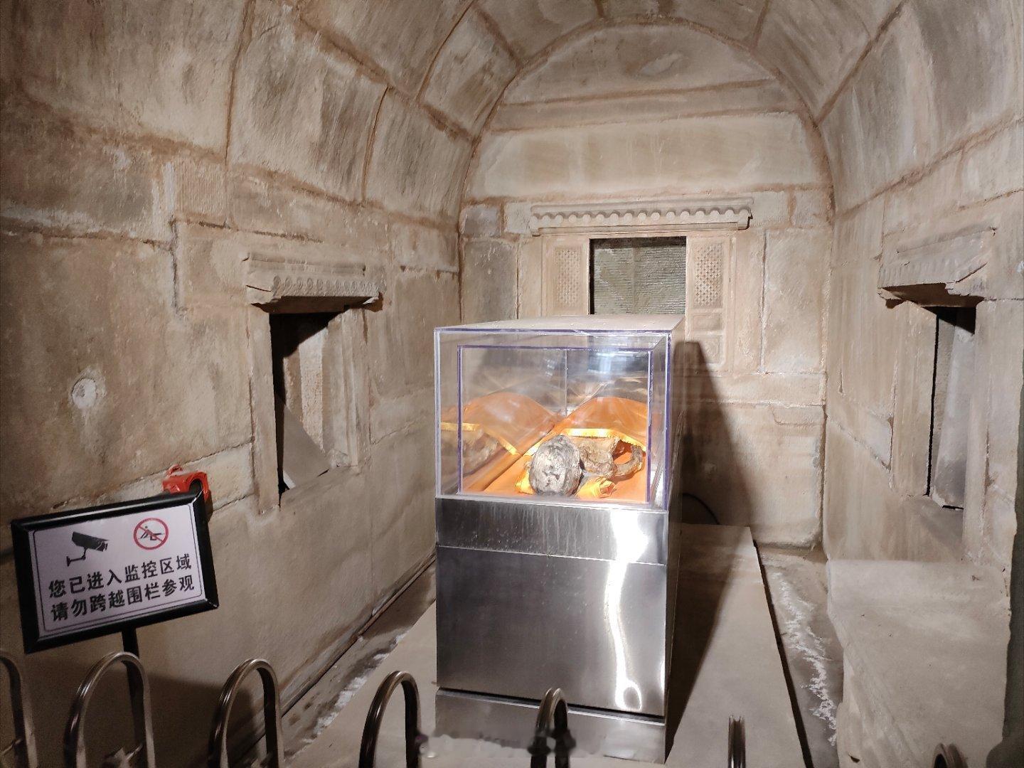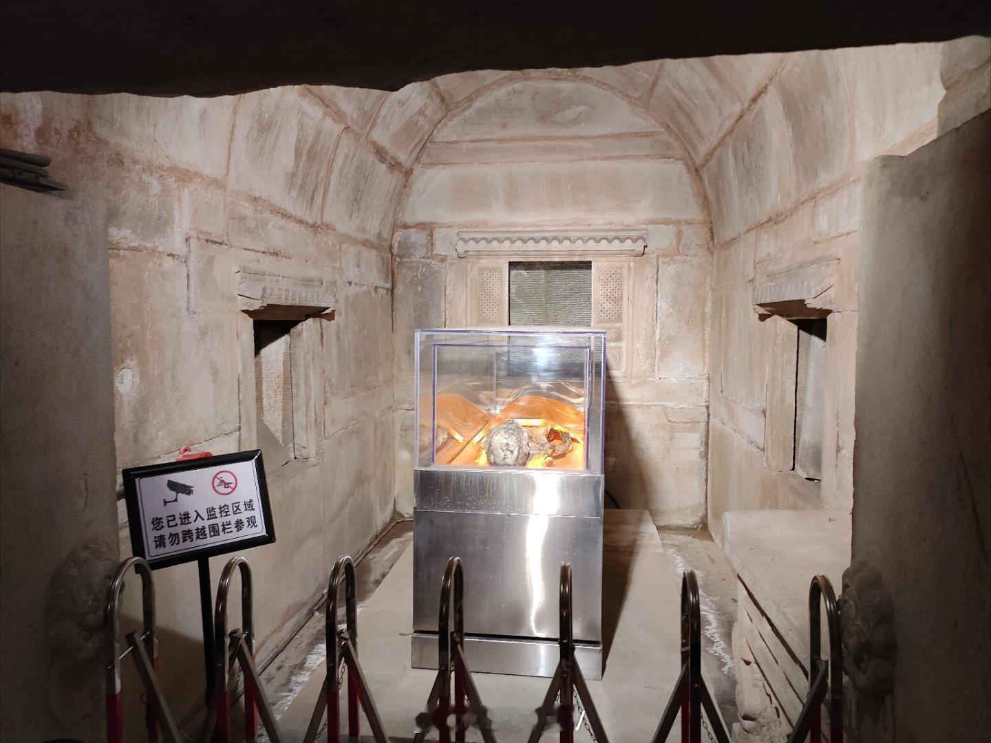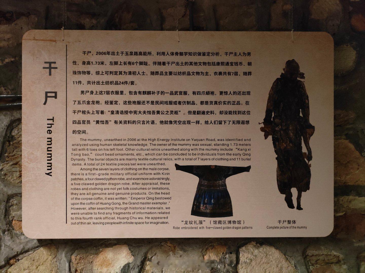 关于大家关心的洪承畴和康熙的事情,我今天就去了黄㤕吾干尸展。黄㤕吾干尸出土时左脚有六个脚趾,身为五品官却身穿五爪金龙龙袍正品,历史资料查无此人等等……这些都是写在宣传牌上的。只不过参观的角度只能看到干尸的头,看不到脚趾。如果大家有兴趣,可以到石景山石刻博物馆,或者搜田义墓,来这里就能看到,晚上出个视频介绍一下