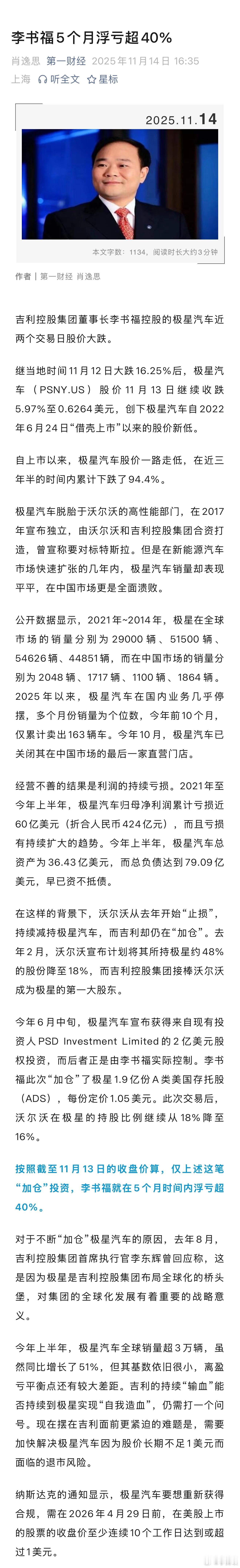 舒服哥现在舒服不起来!自上市以来,极星汽车股价一路走低,在近三年半的时间内累计下跌了94.4%。话说吉利汽车现在的市值管理能力,简直惨目忍睹!