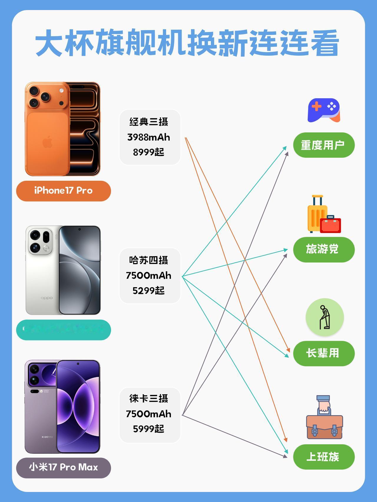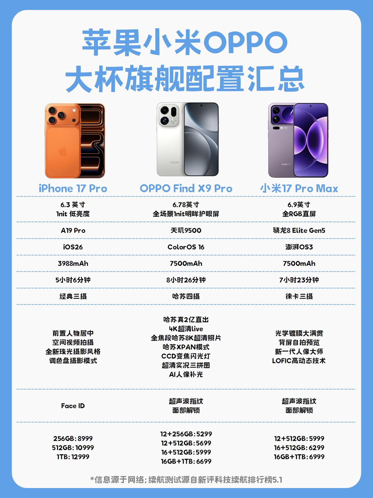 年底换机纠结症犯了!3大爆款旗舰选谁? 攒了大半个学期的生活费,终于准备年底前给自己换台新手机 我个人比较喜欢拍照、旅游,对手机的影像、续航比较重视,📱研究了半天最近的热门旗舰,这三台大杯旗舰真的让我纠结症犯了…… ✅iPhone 17 Pro 苹果这回外观大改了,看着有点不适应,不过质感手感还是很好的,而且性能强、够流畅,还有潜望镜长焦,拍照也不错,感觉上班族、学生党都够用了,就是💰不便宜,8999起步 ✅OPPO Find X9 Pro Find X9 Pro回归矩形deco,搭配冷雕一体工艺,颜值简约大气,质感也很好。影像上有哈苏四摄,直接配上2亿长焦,还有丹霞镜头、4k live实况、AI人像补光灯功能,拍照出片更简单!再加上7500mAh大电池,续航有8h26min,出门拍一天都够用,被称为旅拍神器,适合旅游党、重度用户,5299起步价比较符合我的预算 ✅小米17 Pro Max 这台手机整体配置挺猛的的,用上了骁龙8 Elite Gen5处理器,影像上还配有徕卡三摄,背屏还可以自拍预览,玩法很丰富。加上电池也有7500mAh,续航足足7h23min,很持久,适合喜欢尝新的朋友! 🤔有一说一,三款机子都很不错,怎么选就看我们自己的预算和需求了,反正本旅游+学生党准备冲OPPO了,毕竟拍照和续航才是我的刚需!你们会选谁?欢迎来评论区交流呀~ OPPO Find X9