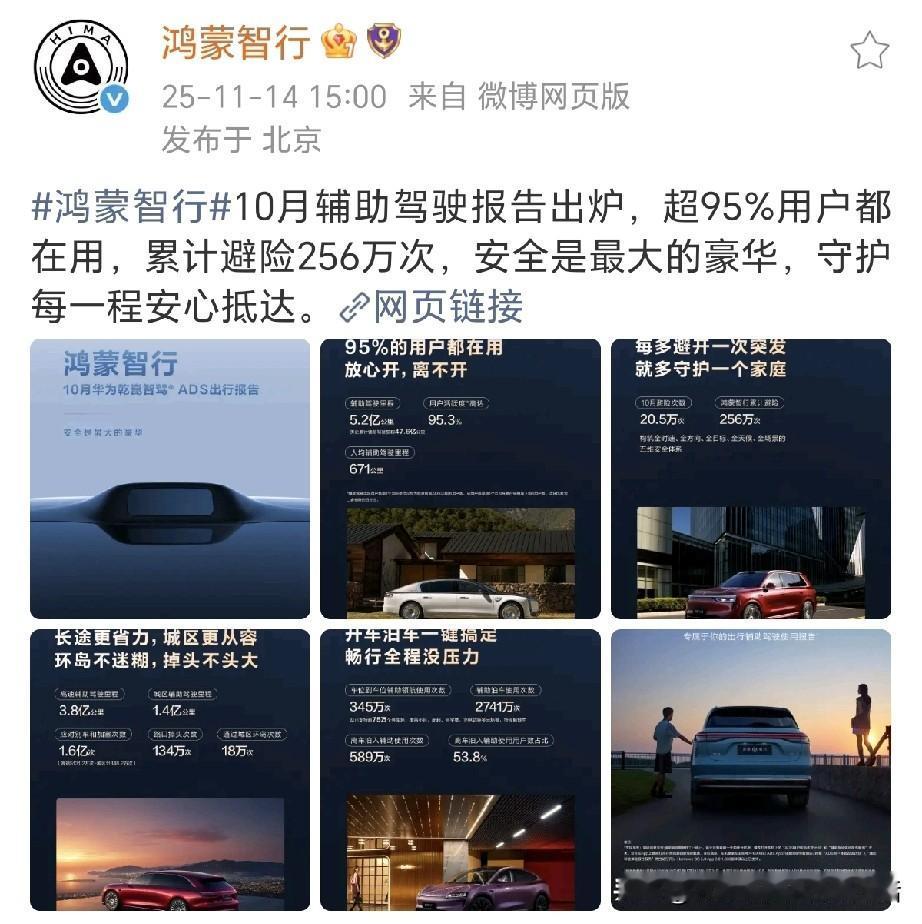 安全是最大的豪华的含金量还在上升! 鸿蒙智行真是无敌是多么寂寞! 鸿蒙智行官宣10月辅助驾驶报告!这次把长图换成了6张图,直观很多了。 鸿蒙智行已形成“五界十车”完善的产品矩阵,覆盖更多元的用户需求。随着搭载乾崑智驾的车型越多,这个大数据爆发速度只会加快。 这六张图里面有两个提到比例的,辅助驾驶活跃用户占比95.3%,离车泊入辅助使用用户数占比53.8%。 细致极恐的是历史累计辅助驾驶里程47.6亿公里,好用,敢用的辅助驾驶越用越聪明,越用越好用。越好用就会越有人用。 今年9月余总在山城重庆,开全新问界M7用华为ADS 4挑战了10多个复杂道路场景,一把过! 余总亲身体验产品的安全性本身就非常值得敬佩,为余总点赞!