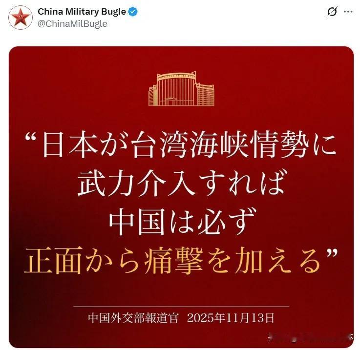 看我们军方多贴心,生怕日本看不懂! 11月14日,中国军号用中文、英文、日文强直接回应日本首相的涉台言论!内容为“如日方胆敢武力介入台海局势,将构成侵略行为,中方必将迎头痛击!” 这回日本首相高市早苗好好看看清楚,日本字总认识吧,千万不要放着好日子不过,更不要忘记历史,历史的教训好好回忆一下,有助于发表言论时谨慎发言。 这次我们强硬回应日本,更加说明我们在台湾问题上的态度,任何人都不要试图拿台湾来试探我们的底线,历史不只是用来回忆和铭记的,更是前车之鉴。