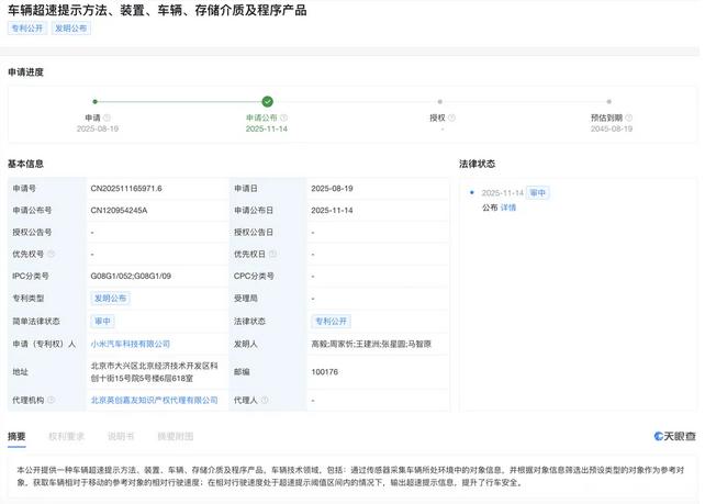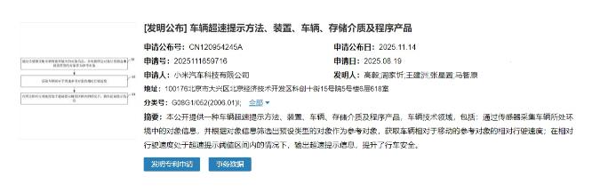 11月14日,天眼查显示,近日,小米汽车科技有限公司申请的“车辆超速提示方法、装置、车辆、存储介质及程序产品”专利公布。 摘要显示,本公开涉及车辆技术领域,包括:通过传感器采集车辆所处环境中的对象信息,并根据对象信息筛选出预设类型的对象作为参考对象,获取车辆相对于移动的参考对象的相对行驶速度;在相对行驶速度处于超速提示阈值区间内的情况下,输出超速提示信息,提升了行车安全。 点个关注吧!汽节车社,车圈热点资讯每日一扫清!【来自懂车帝车友圈】