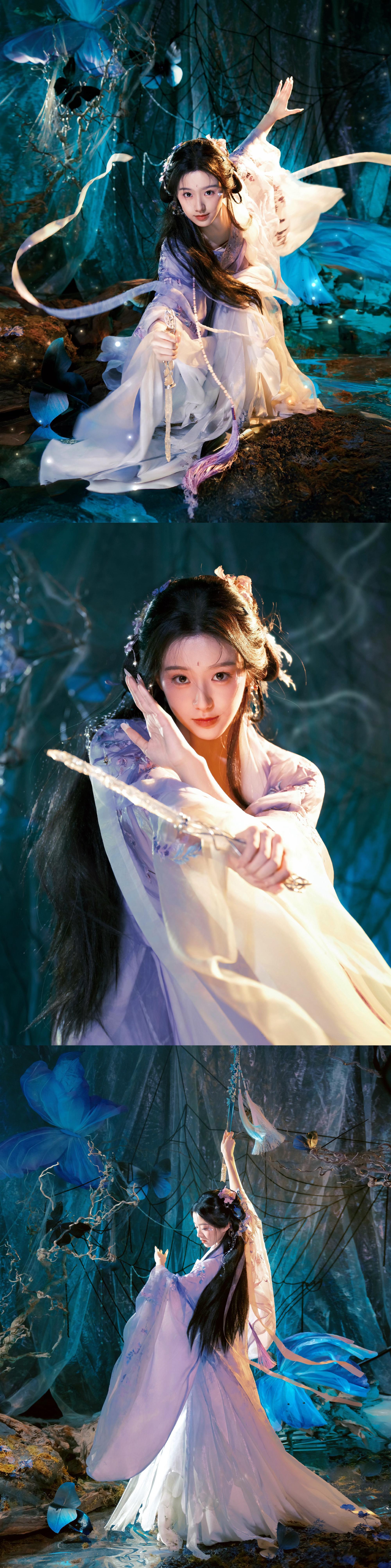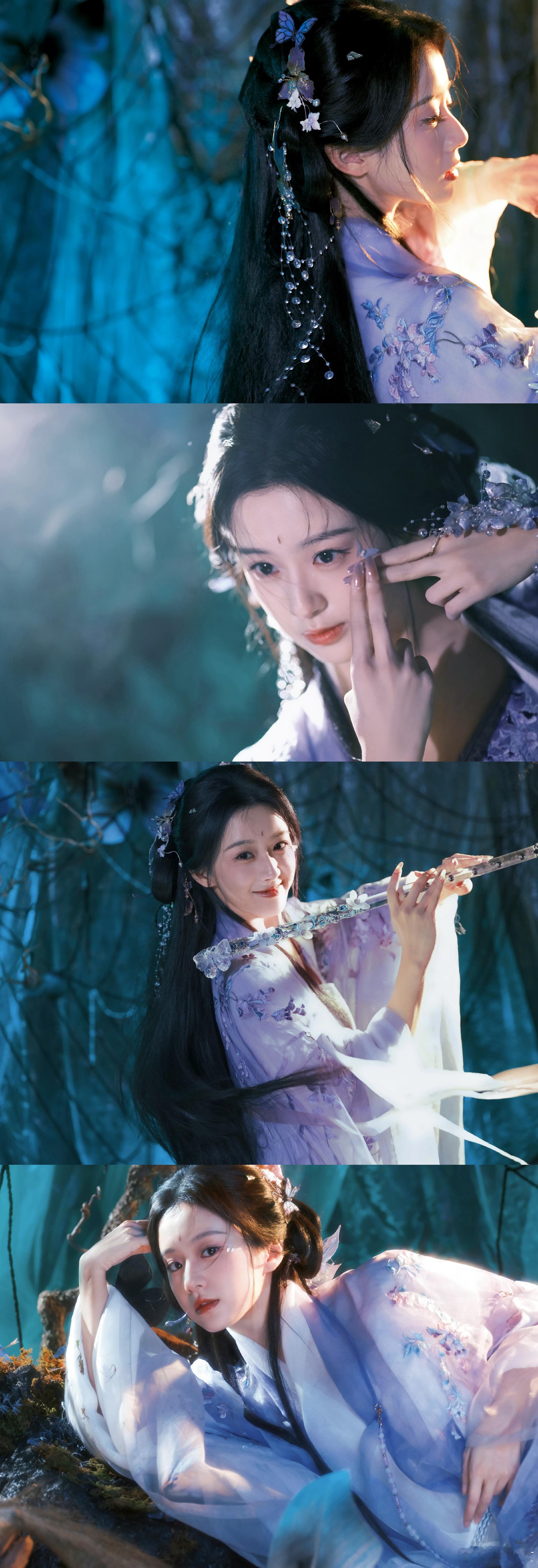 包上恩的古风造型真的越看越上头。淡紫色汉服自带温柔滤镜,小蝴蝶造型也很灵动,再加上有聊斋感的背景氛围,整体看着特别协调!