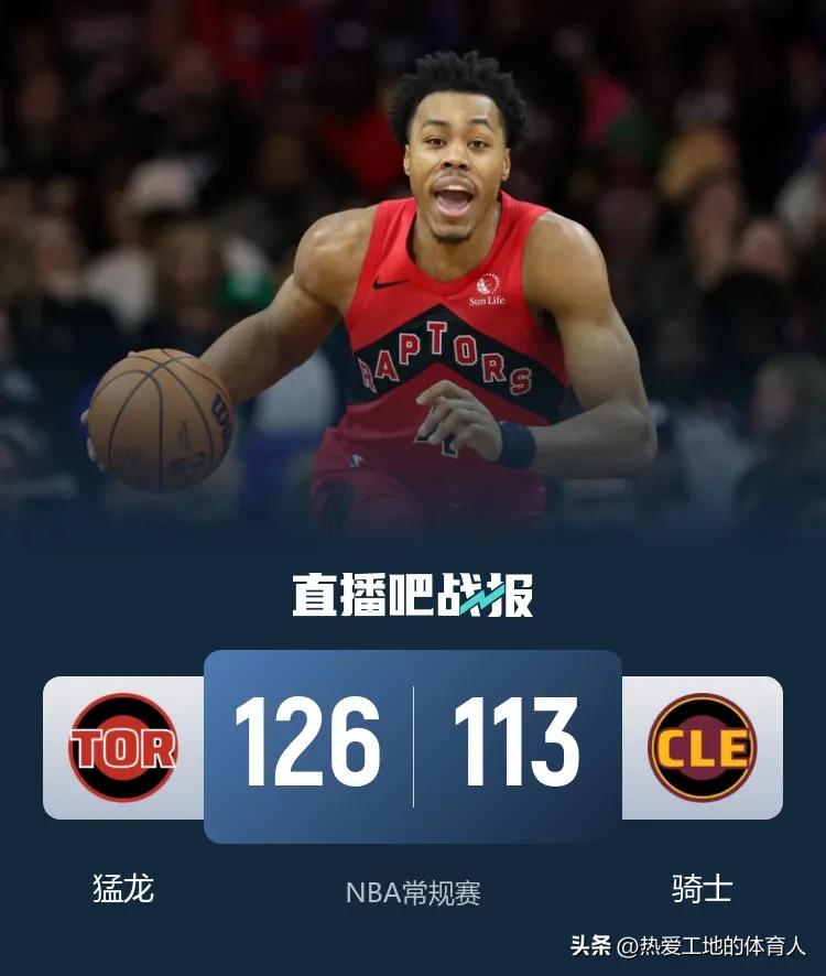 NBA常规赛继续进行 东部第八猛龙126:113击败东部第二骑士 猛龙队本场比赛有着良好的竞技状态,首节两队你来我往难分伯仲,次节比赛猛龙迅速拉开分差,半场比赛结束猛龙67:54领先骑士13分。下半场比赛骑士队展开反扑,第三节骑士队追回8分将分差缩小到5分,但是末节比赛猛龙守住了领先优势,再次追回8分,最终领先13分结束本场比赛。 猛龙队首发三人砍下20+得分,骑士队这边米切尔空砍31分。 恭喜猛龙取得本场比赛胜利 NBA骑士队 多伦多猛龙