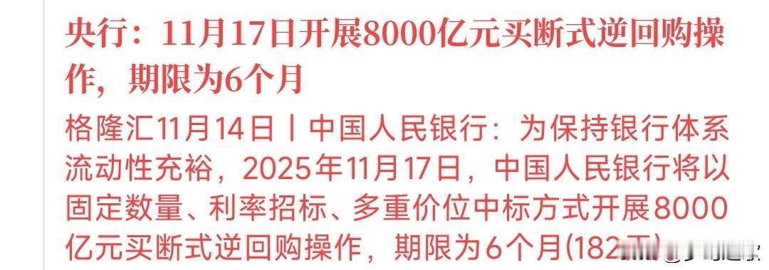 A股刚刚收盘后,大利好就来了,央行再次释放流动性。 今天盘后A央行发布公告,将会开展8000亿的买断式逆回购操作,也就是说往资本市场释放了8000亿的流动性。 最近的A股确实不太好,今天还跌破了4000点的大关,如果周一不能收回来,将会开启新一轮的调整,尤其是前期大涨的科技股,将会是重灾区。 政策对资本市场的呵护其实就是给投资者一记定心丸,让投资者放心,有村里给托底,股市跌不下去。从央行的操作看,下周有望开启一轮超跌反弹。