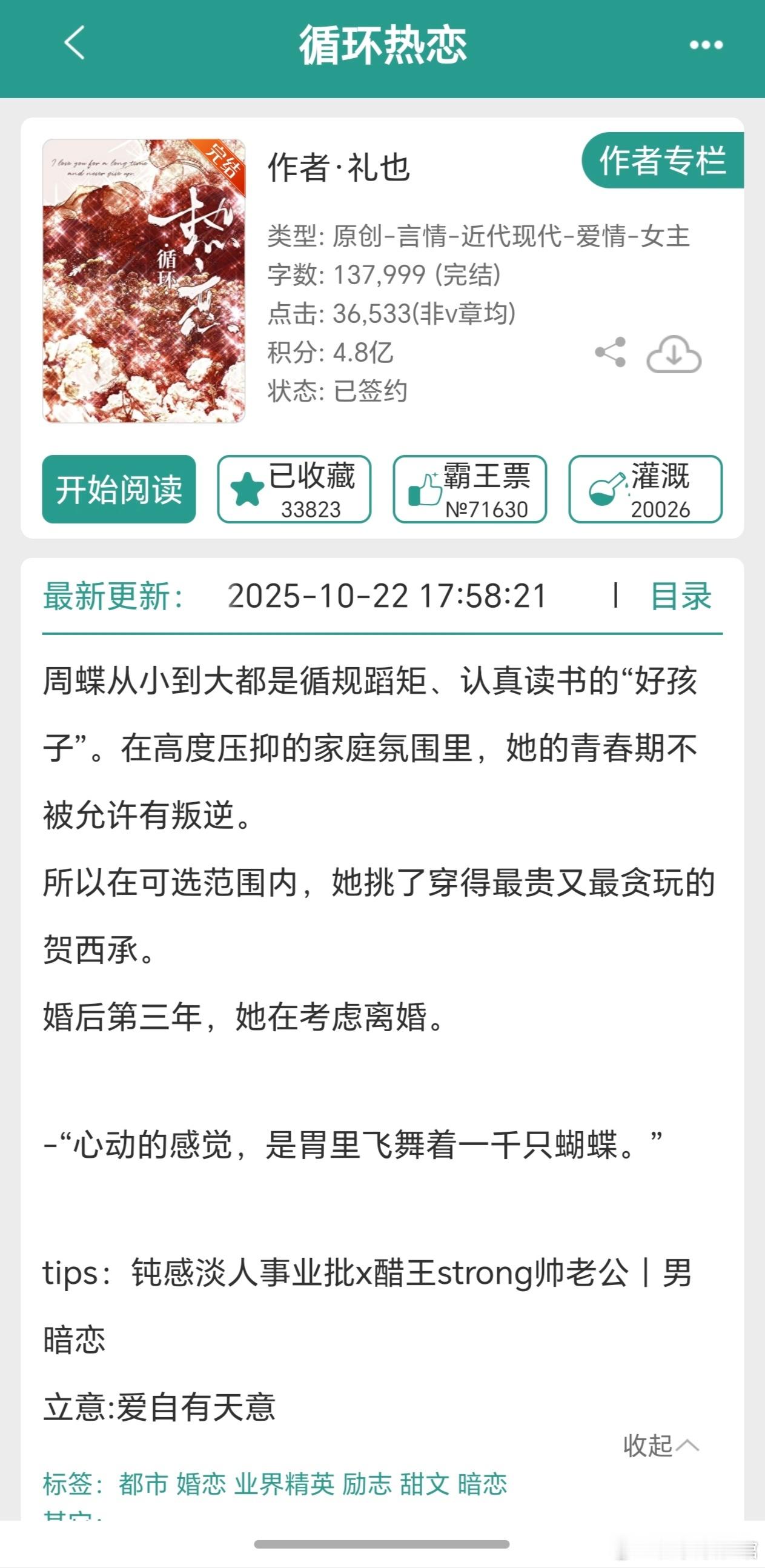 《循环热恋》作者:礼也男主视角暗恋成真,女主视角日久生情看似玩世不恭实则纯情醋王,感情钝感事业批女主文一开始就是男主女主结婚快三周年,结束异地真正同居生活女主在事业上节节攀升,不断进步,努力赚钱给妈妈换房子。女主不想用男主的钱,他们结婚时有个三年协议,想着到期离婚,不能欠男主。但是女主一想到离婚后不能和男主在一起就难受,在相处中渐渐爱上了男主,也是到现在才明白。女主想到男主说过就是喜欢女主不喜欢他的样子,放弃了表白男主在高中就喜欢女主了,但是她是循规蹈矩的乖乖女,男主暗戳戳告白,还写情书,女主都没get到,实在是两人差距太大了。后来大学是男主主动接近她,但是感情主导生女主,女主说在一起就在一起,上结婚就结婚。女主最后感情上和你迟钝,但是男主回自我攻略啊女主意识到自己喜欢男主后,男主当时误会了女主,单方面冷战。女主从闺蜜口中得知了男主喜欢她,还找到了男主暗恋她的痕迹,主动告白,男主立刻又傲娇起来这篇文很甜,小短篇,有肉渣,男主挺行的,抓住机会就和女主生命大和谐男主女主原生家庭就不提了,也算是相互救赎
