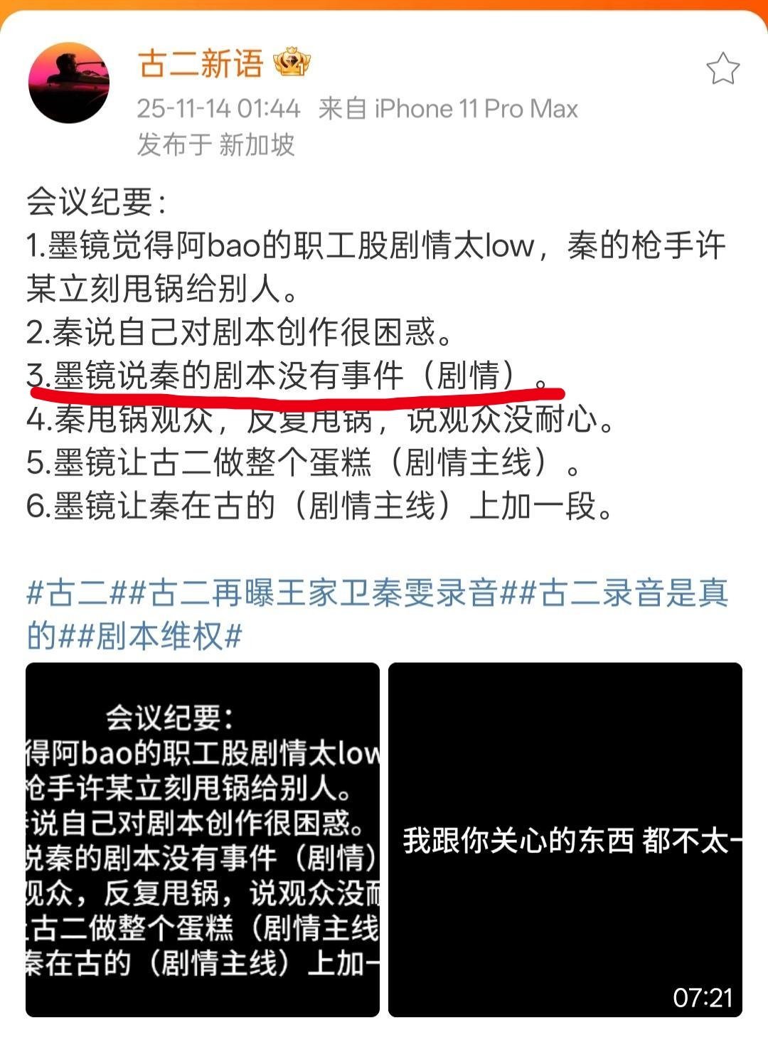 根据古二最新的录音,王家卫对秦雯写的剧本的评价是“没有事件(剧情)”。潜台词是根据秦雯写的东西根本没法拍。所以才找古二救场。所以秦雯是怎么好意思在领奖台上夸夸其谈的?