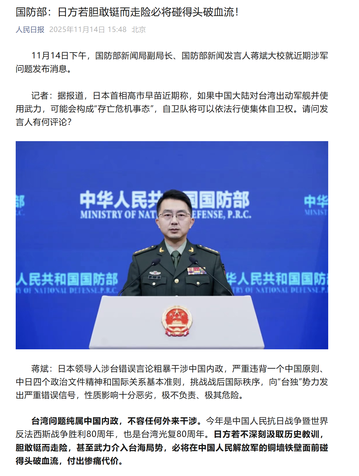 【 】今年是中国人民抗日战争暨世界反法西斯战争胜利80周年,也是台湾光复80周年。近期日本的表态,算是1945年日本战败以来,日本领导人首次对中国发出的武力威胁,用心极其险恶。日本三年来在我周边实际军事准备,全部是为了备战:情报侦查监视态势感知从未停止、岛链远程火力打击覆盖我江浙沪区域、水雷布射能力可短期封锁水道、潜射巡航导弹近岸发射可以打到我中部,甚至核武器的制造所有条件都具备。这是一个危险的信号。百年来日本非常擅长在我方腹地各领域搜集各类情报,他们是吓不退的。必须要有两手准备,两手都要硬。