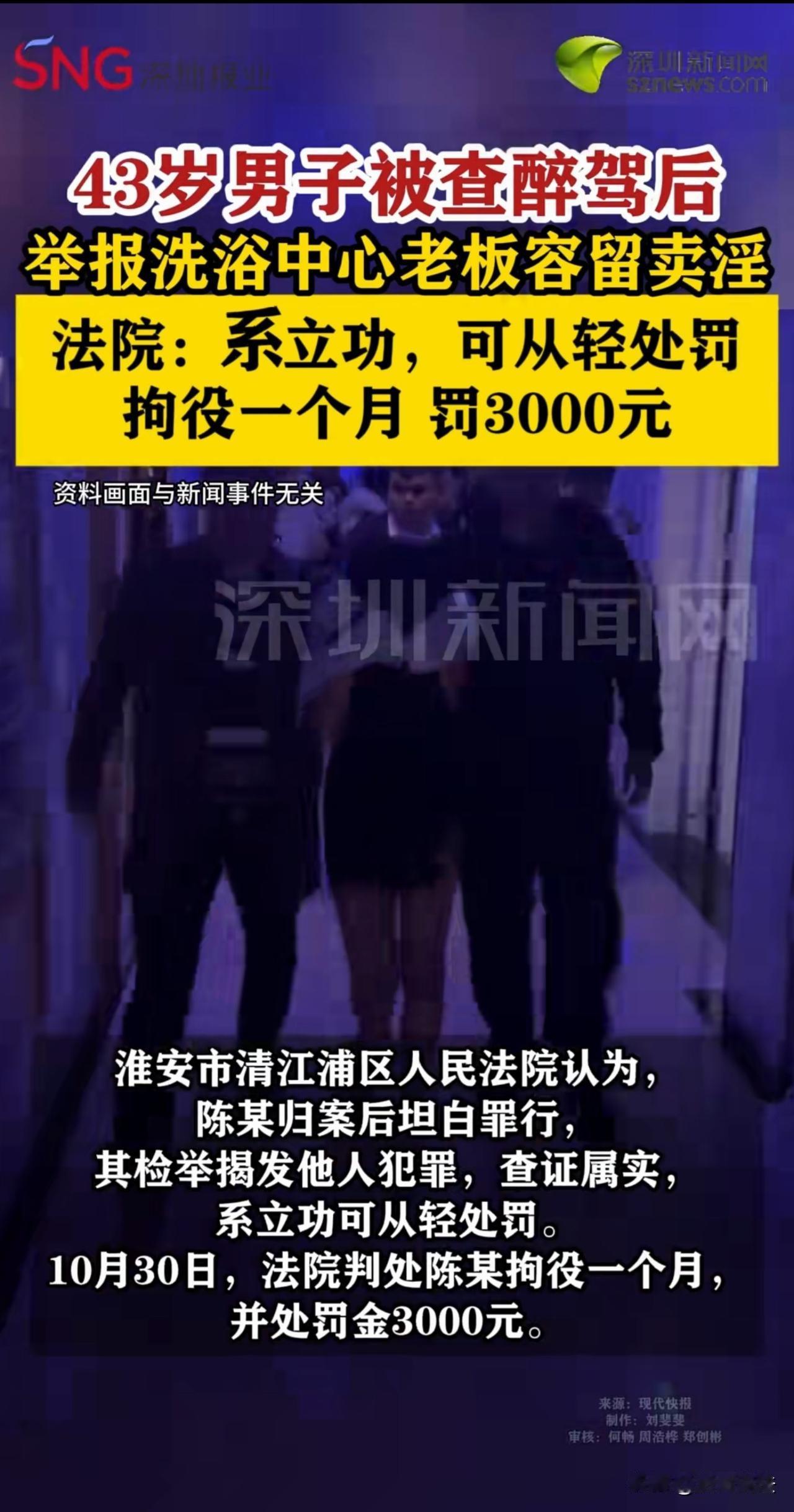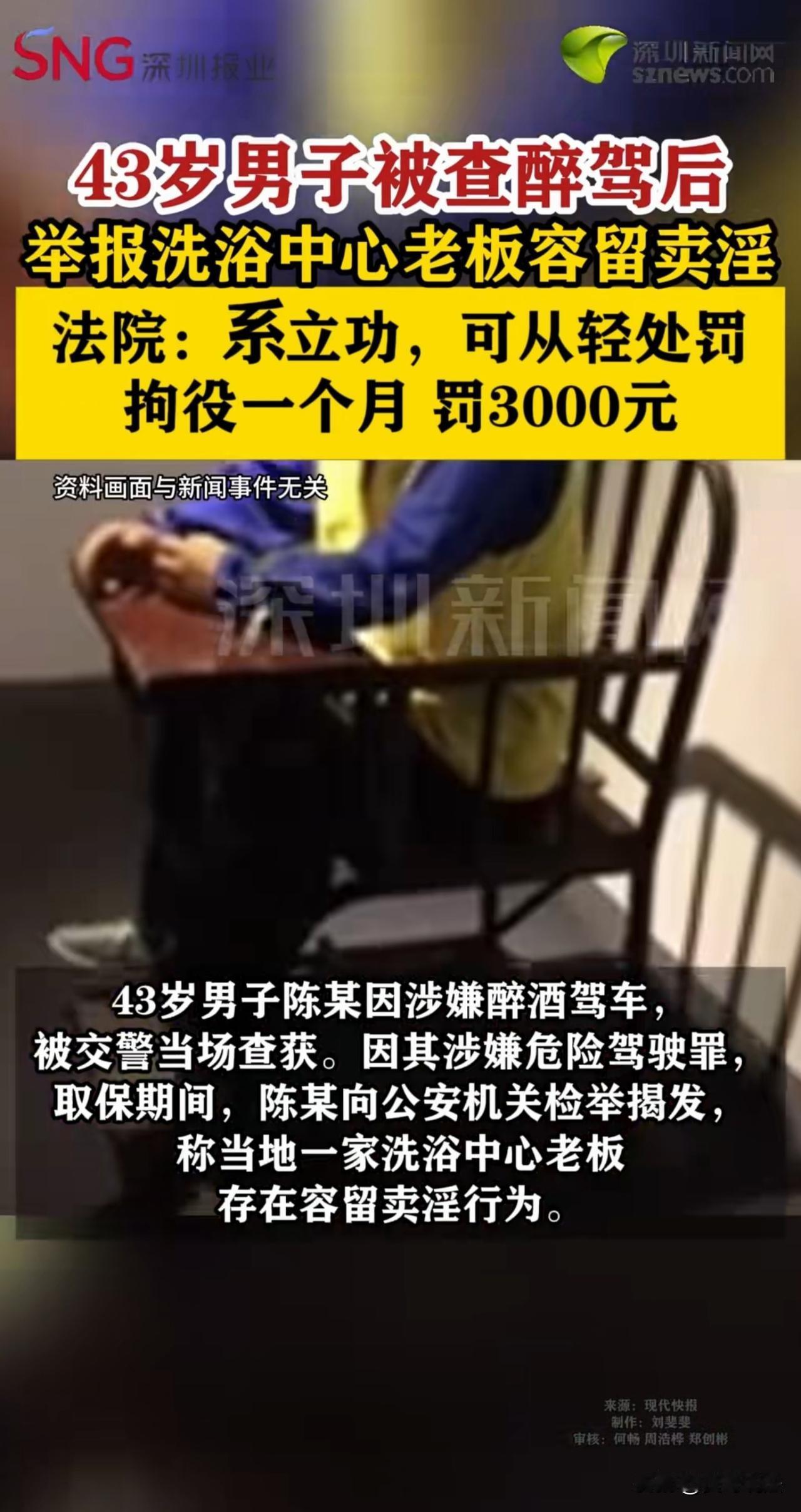 江苏淮安,一名男子因醉驾被抓后,为减轻罪责,果断举报当地一家洗浴中心涉黄。警方依据该线索,迅速将三名犯罪嫌疑人成功抓获。随后,男子因立功从宽获刑1个月,并处3000元罚款。 网友:“这波操作有点秀”! 2025年1月16号凌晨,男子陈某饮酒后,头脑仍有些晕乎,却凭着一股“自信”,在停车场开上了自己的小轿车回家。 结果没开多远,就撞上了正在执勤的交警,当场被拦下。 交警闻到陈某身上的酒气,立刻安排酒精检测。 检测结果出来显示,陈某血液中的乙醇含量达192.8mg/100ml,无疑是醉酒驾驶。 显然,这已不是普通违章,而是涉嫌危险驾驶罪,陈某被警方当场扣留。 几天后,陈某办理了取保候审,暂时回了家。 本以为陈某会乖乖配合调查、反省过错,没想到他转头有了大动作。 4月16号,陈某主动到公安机关,实名检举当地一家洗浴中心老板容留卖淫的违法行为。 公安机关接到线索后迅速核查,很快将三名犯罪嫌疑人抓获。 陈某的举报有了实际效果。 那么,法院会如何给陈某定罪量刑呢? 陈某醉酒驾车的行为构成危险驾驶罪。 其血液酒精含量达192.8mg/100ml,远超80mg/100ml的醉酒标准,且在道路上驾驶机动车,完全符合《刑法》第133条关于“危险驾驶罪”的规定。 在量刑上,犯该罪的统一处拘役并处罚金,拘役期限为1个月至6个月。 也就是说,一般情况下,陈某会被判处1至6个月拘役。 然而,陈某在取保候审期间,检举了洗浴中心老板容留卖淫,公安机关已立案侦查并控制三名嫌疑人。 而《刑法》第68条规定,犯罪分子揭发他人犯罪行为,查证属实的,属立功表现,可从轻或减轻处罚。 陈某的行为符合立功标准,在量刑上可从宽。 此外,陈某还存在坦白的从轻处罚情节。 最终,法院依法判处陈某拘役1个月,并处3000元罚金。 当然,有网友对陈某的“举报”行为表示不齿,认为他自己犯罪后不想改造,把举报他人当减刑筹码,充满了算计。 但也有人觉得,洗浴中心容留卖淫本就该查,陈某只是顺水推舟,减刑是他应得的,至少为民除了一害。 对此,你怎么看?欢迎在评论区留言。
