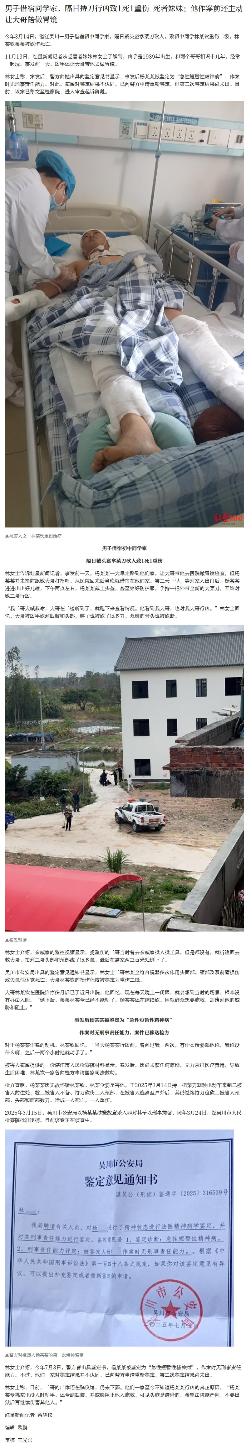 【】 今年3月14日,湛江吴川一男子借宿初中同学家,隔日戴头盔拿菜刀砍人,致初中同学林某钦重伤二级,林某钦弟弟被砍伤死亡。11月13日,红星新闻记者从受害者妹妹林女士了解到,凶手是1989年出生,和两个哥哥相识十几年,经常一起玩。事发前一天,凶手还让大哥带他去做胃镜。林女士称,案发后,警方向她出具的鉴定意见书显示,事发后杨某某被鉴定为“急性短暂性精神病”,作案时无刑事责任能力。对此,家属对鉴定结果不认同,已向警方申请重新鉴定,但第二次鉴定结果尚未出。目前,该案已移交至检察院,进入审查起诉阶段。林女士告诉红星新闻记者,事发前一天,杨某某一大早走路到他们家,让大哥带他去医院做胃镜检查,但杨某某并未提前跟她大哥打招呼,从医院回来后当晚就借宿在他们家。第二天一早,等到家人出门后,杨某某进进出出好几趟,下午两点左右,杨某某戴上头盔,甚至穿好防护服,手持一把外带全新的大菜刀,开始对她二哥行凶。“我二哥大喊救命,大哥在二楼听到了,就跑下来查看情况。他看到我大哥,也对我大哥行凶。”林女士回忆,大哥被凶手砍到四肢和头部,脖子也被砍了很多刀,双脚的骨头也被砍断。